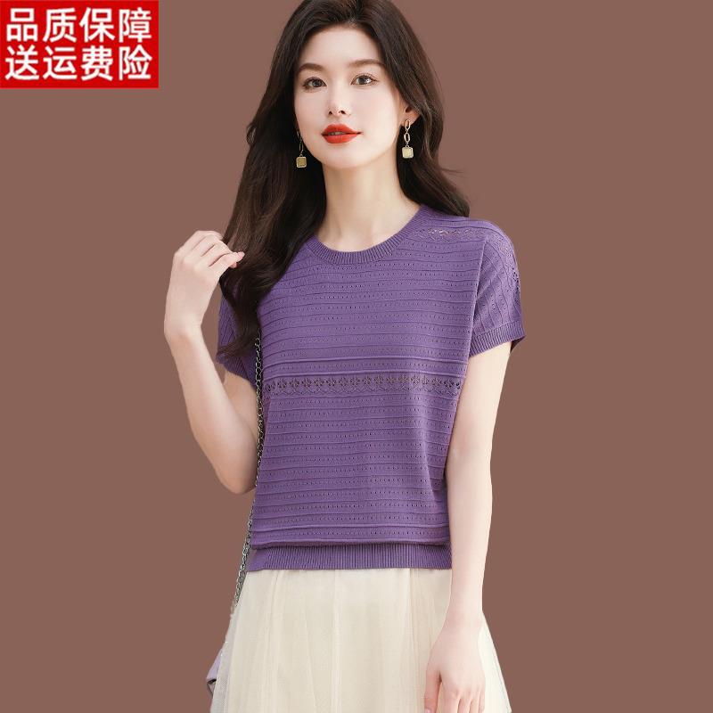 圆领短袖t恤女2025夏季新款宽松短款妈妈镂空薄款冰丝针织衫上衣