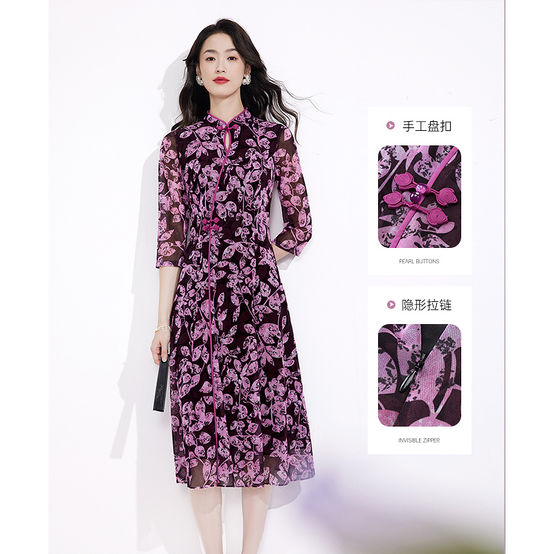 黛玛诗显瘦花裙子秋新款秋新中式中长连衣裙女优雅网纱印花旗袍裙