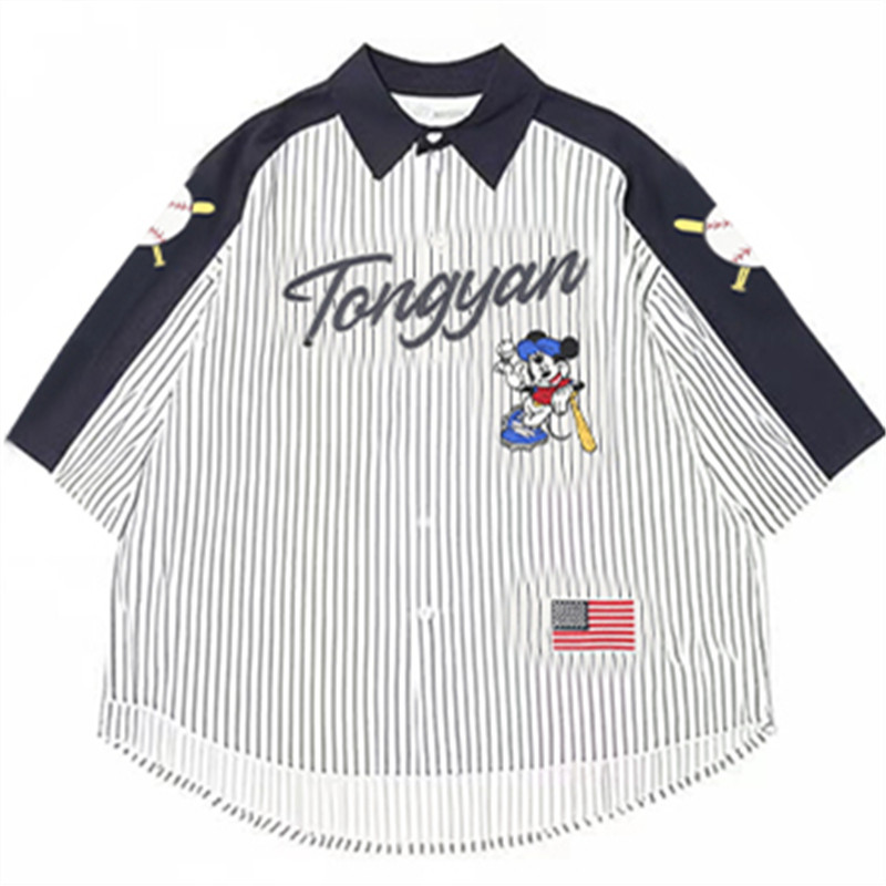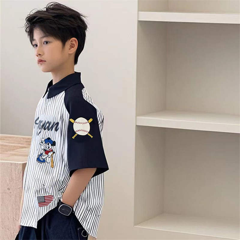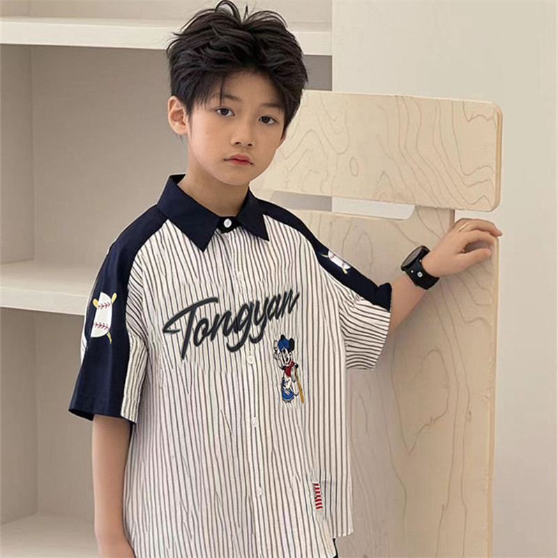 男童复古风拼接卡通夏季短袖衬衫中大童时髦外穿拼色上衣服儿童装