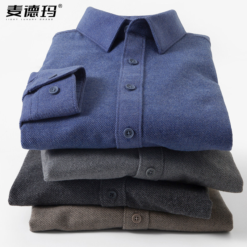 鄂尔多斯市新款厚棉羊毛长袖衬衫男士商务休闲中老年爸爸磨毛衬衣