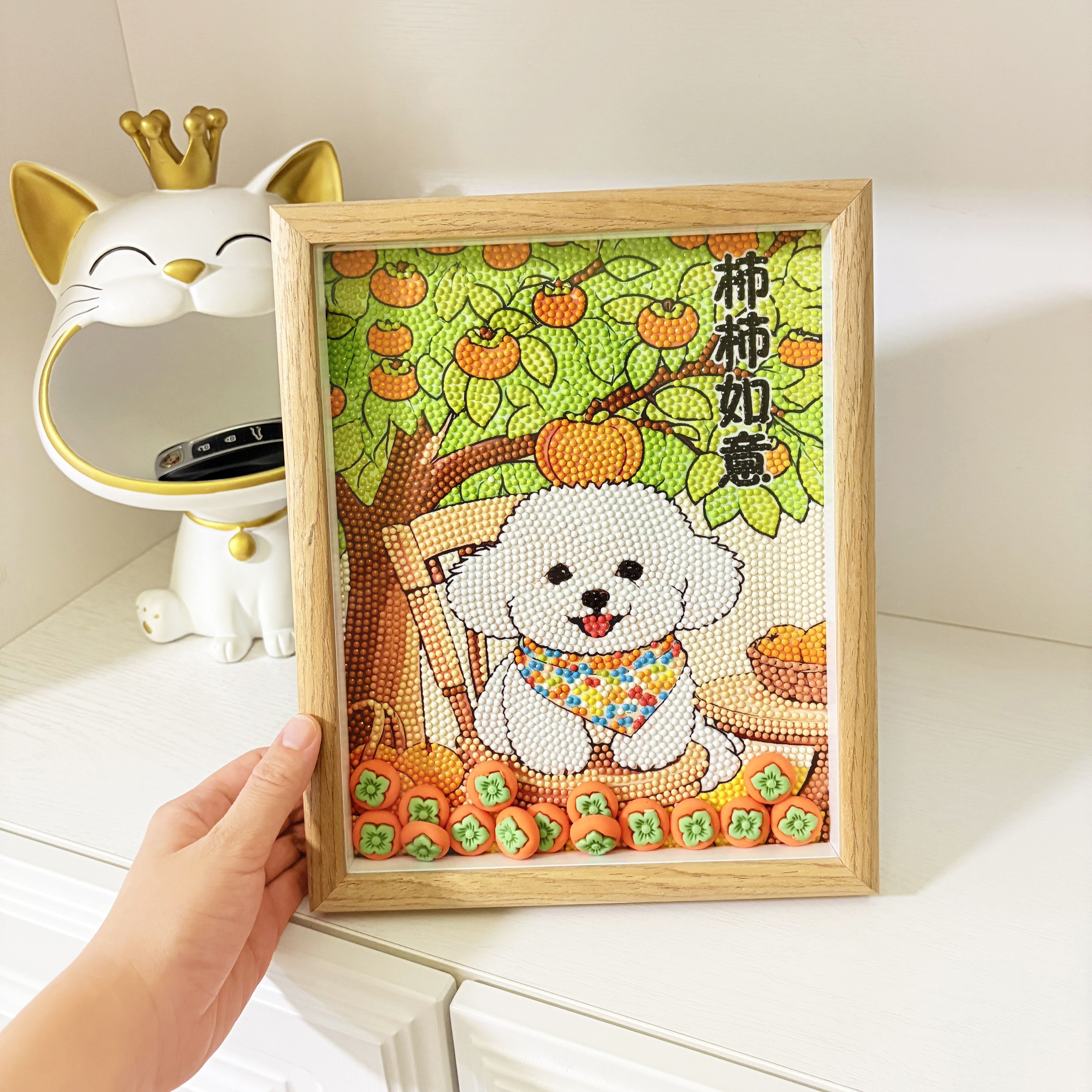 柿柿如意带框钻石贴画2025新款可爱小狗满钻十字绣客厅治愈系水果