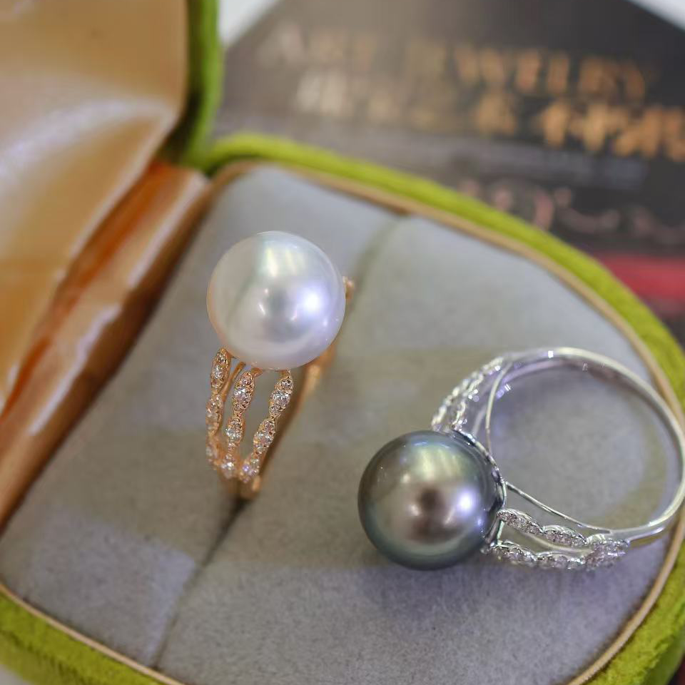 18k金锆石10-11mm淡水珍珠戒指配件精致镂空设计圆形裸珠diy戒托