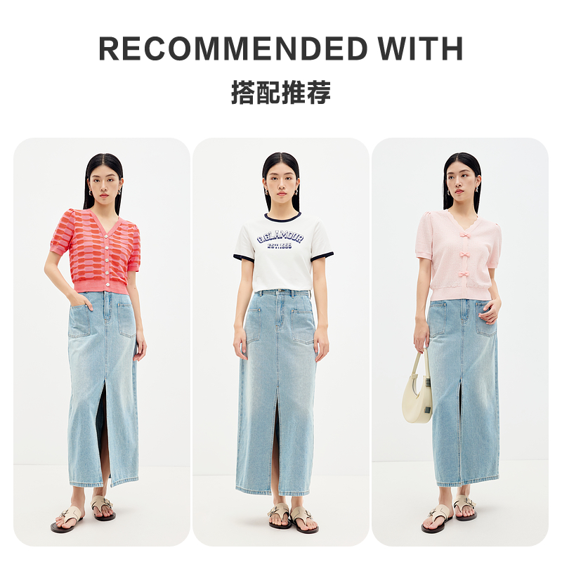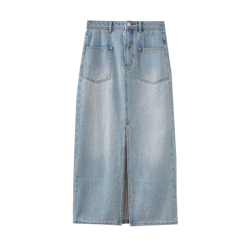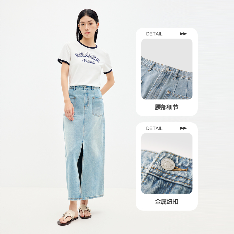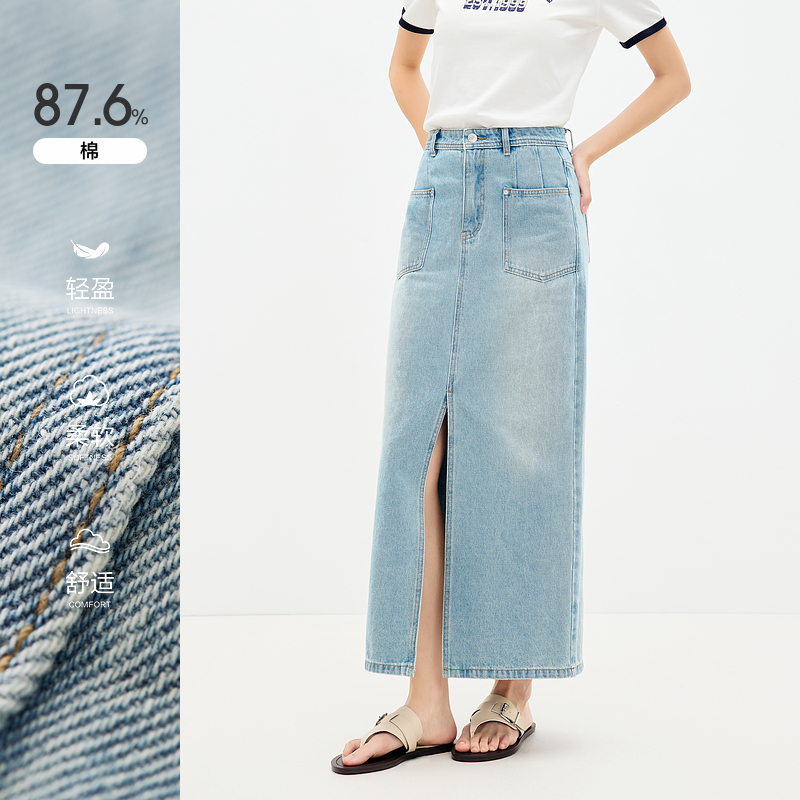 水云间中长款牛仔半身裙女直筒开叉高腰裙子时尚简约2025春季新款