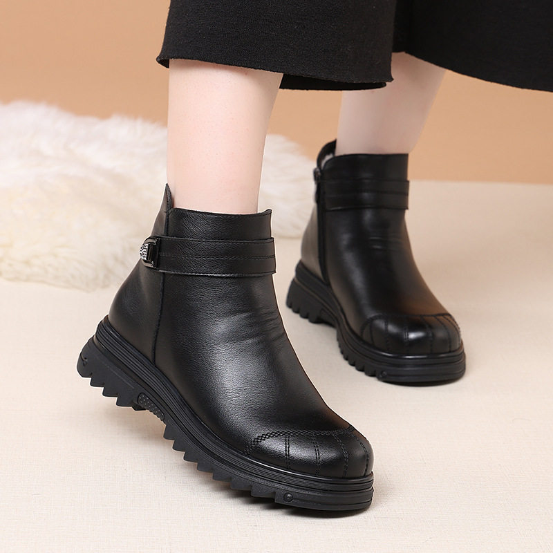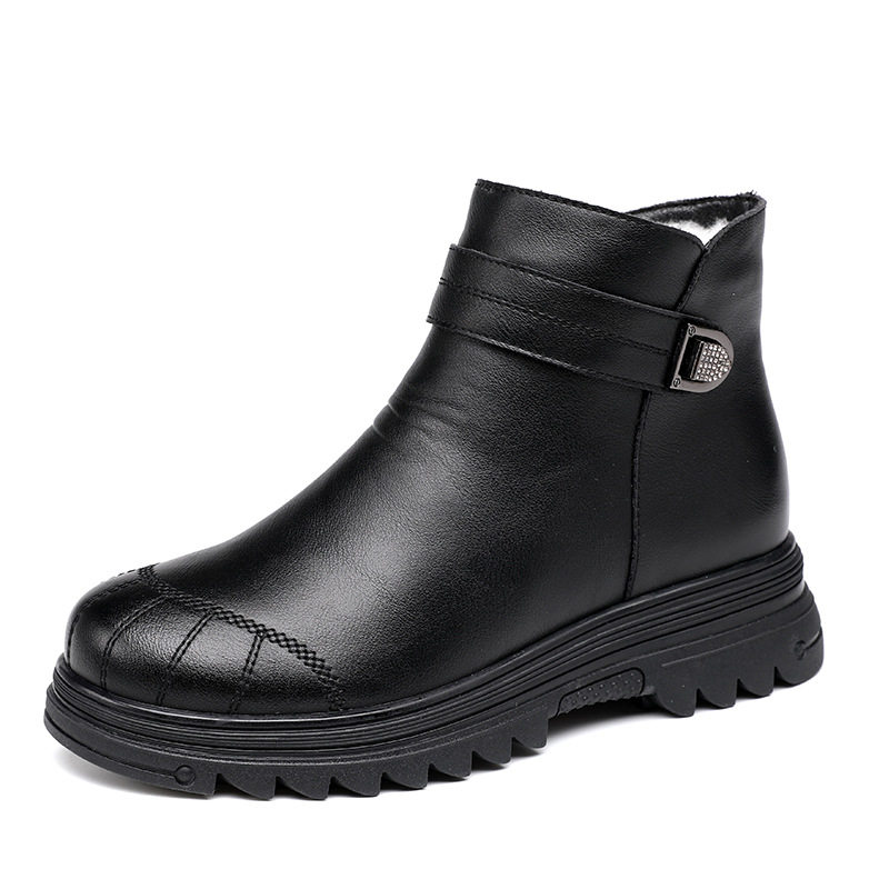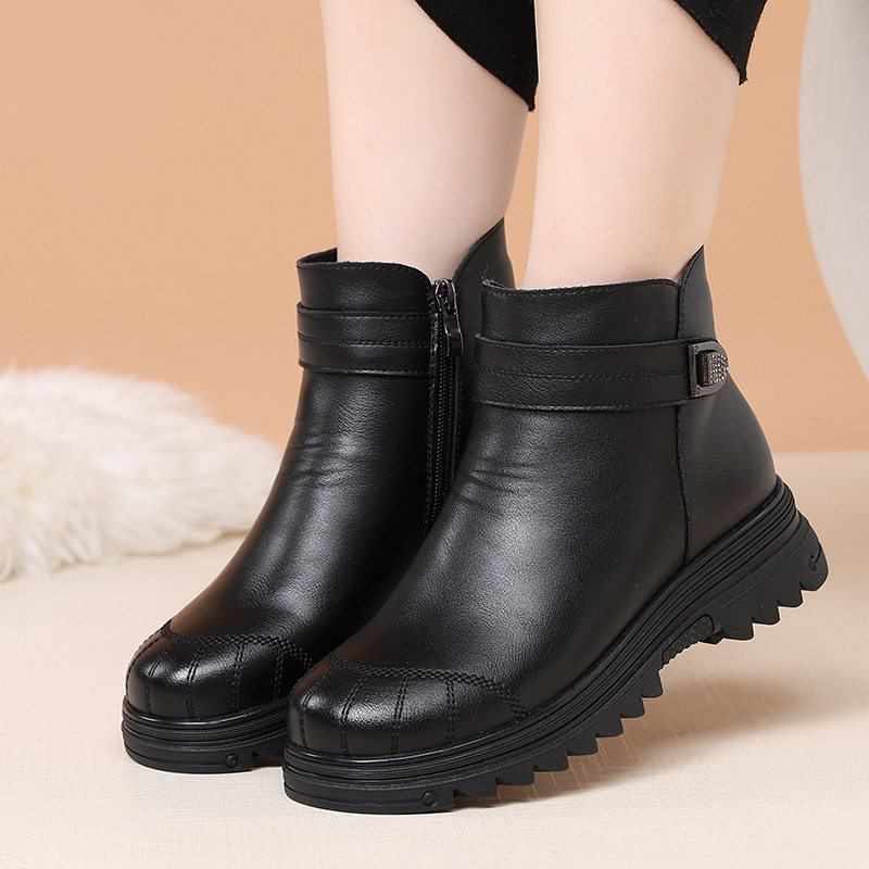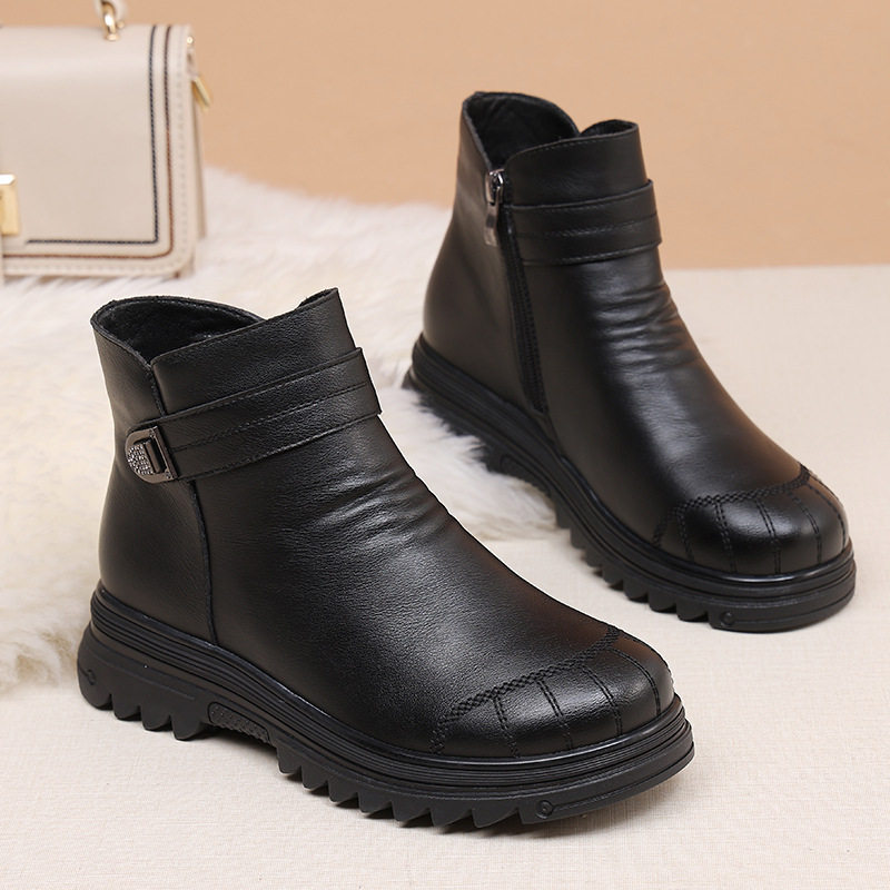 羊毛棉鞋女冬季加绒加厚中老年真皮橡胶底平底妈妈款老人防滑短靴