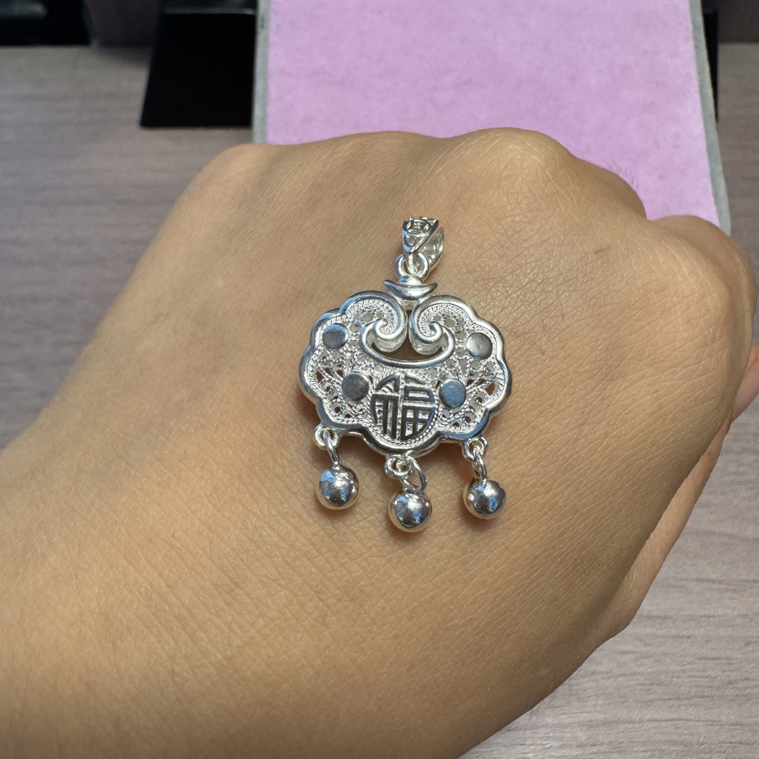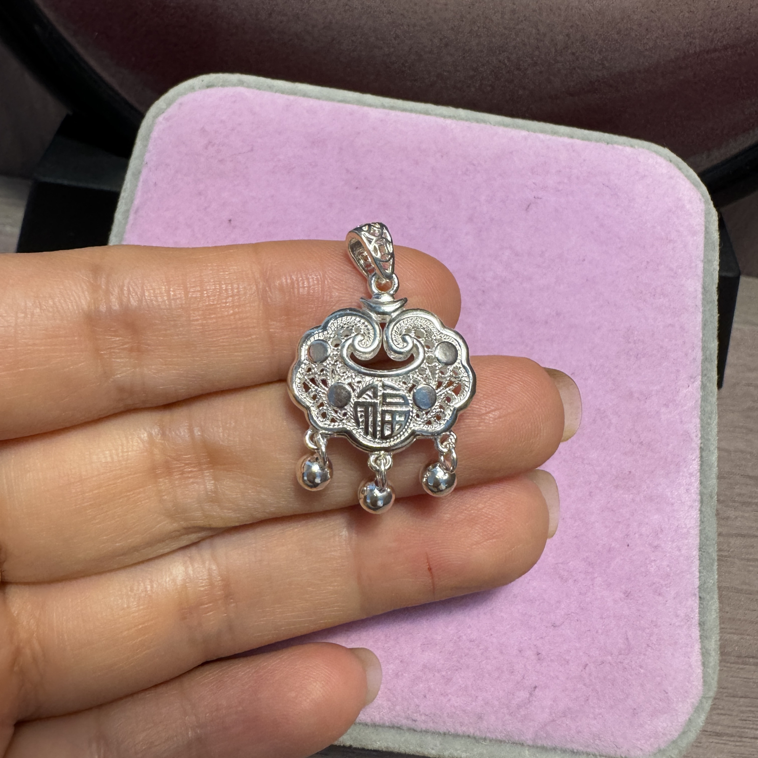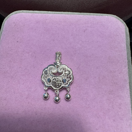 s999纯银长命锁宝宝镂空项链女足银饰吊坠儿童大人平安锁情侣礼物
