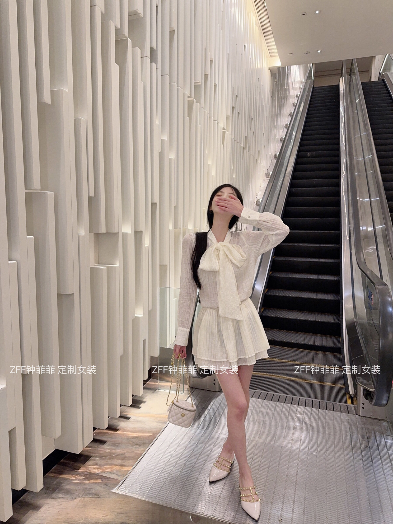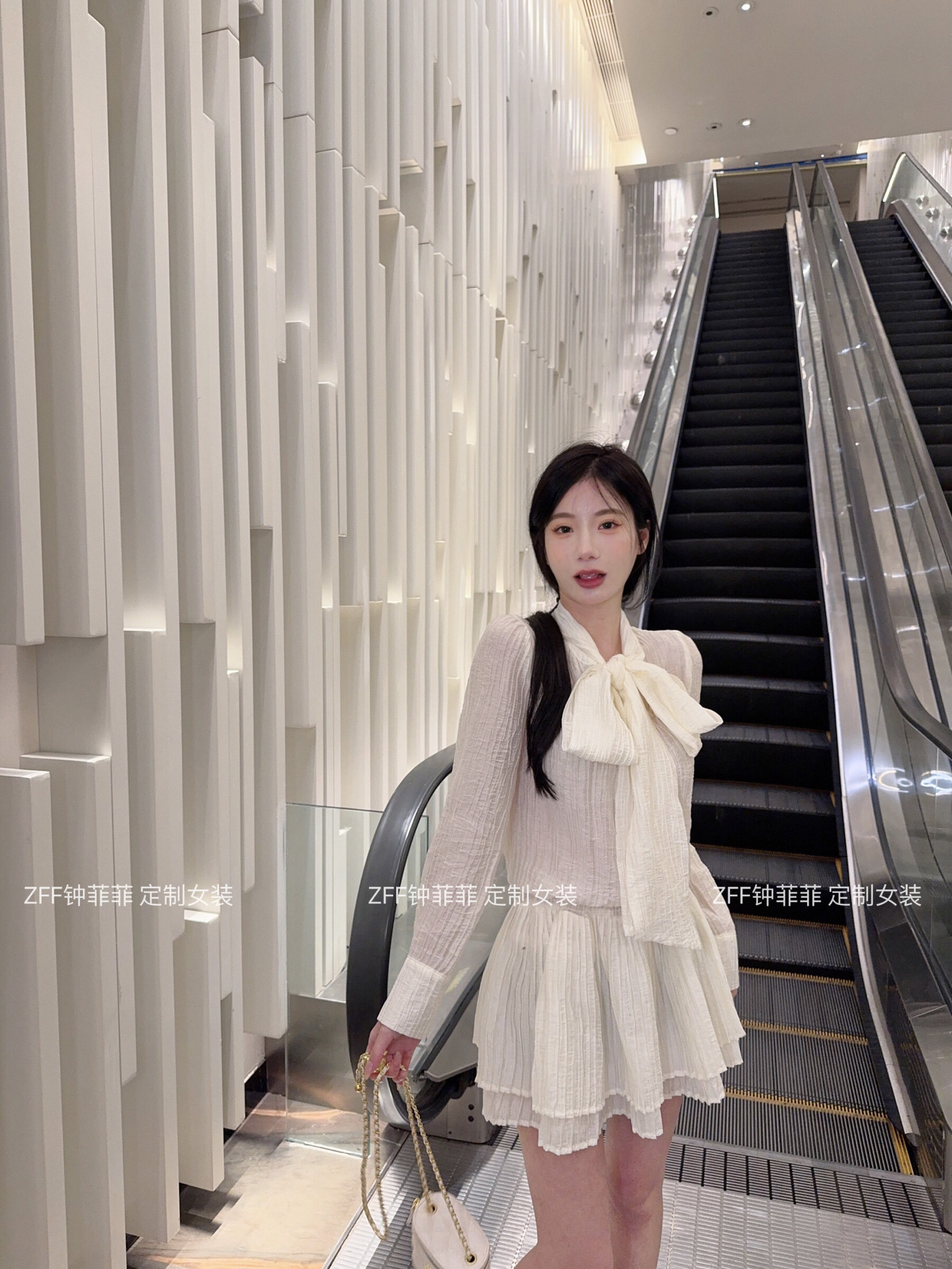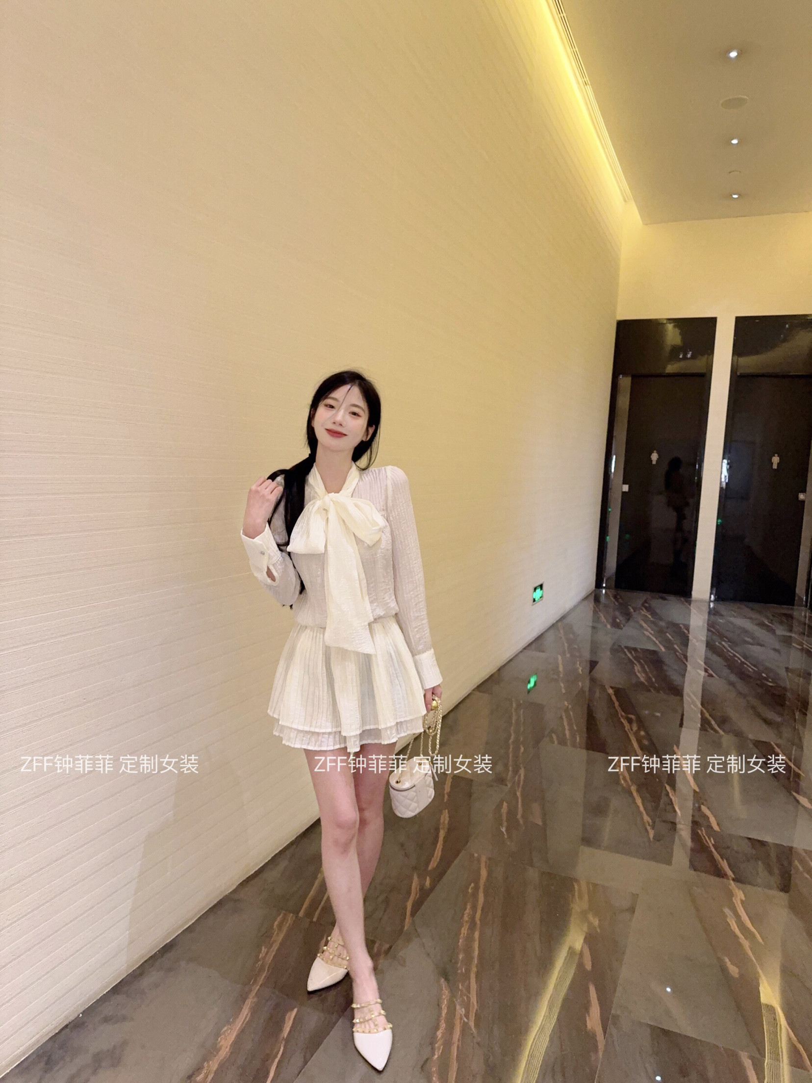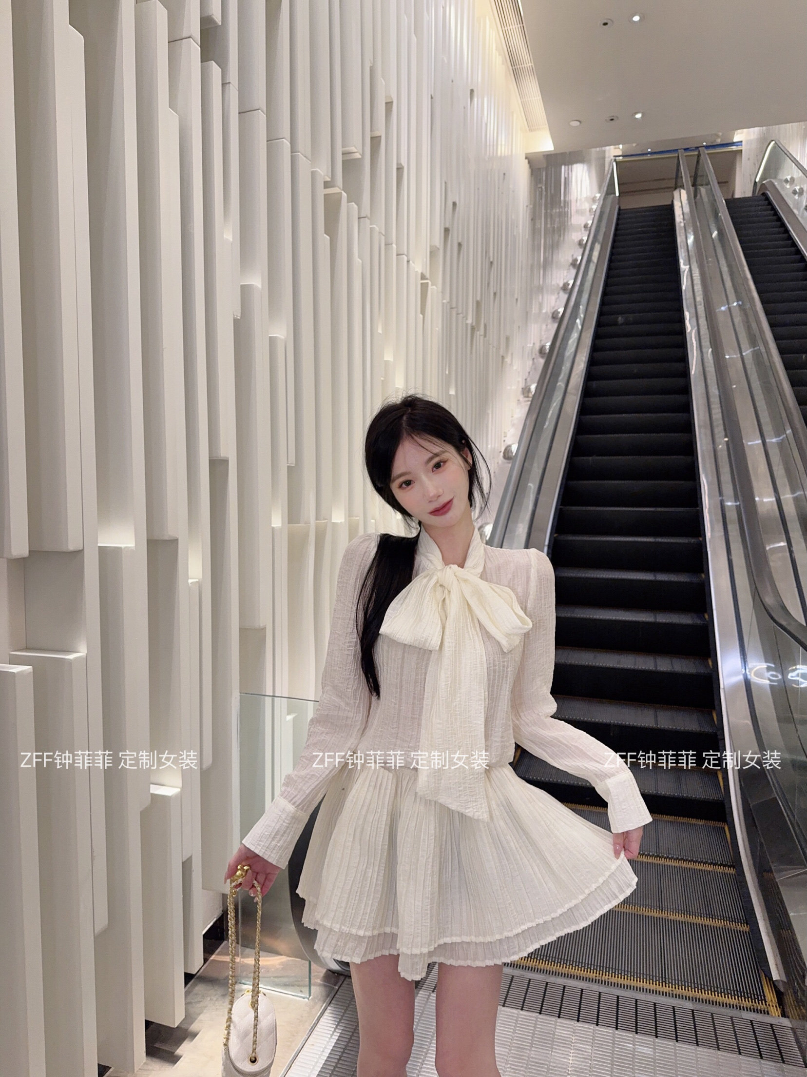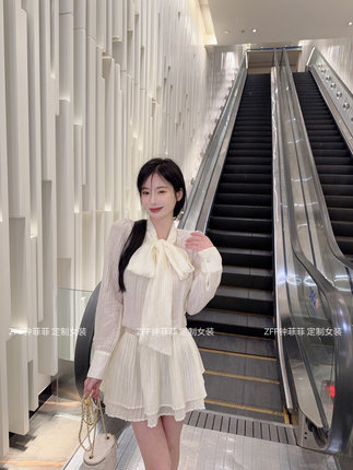 现货蝴蝶结衬衫连衣裙女长袖上衣蕾丝压褶连衣裙收腰A字型