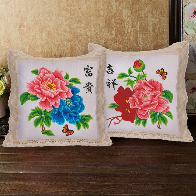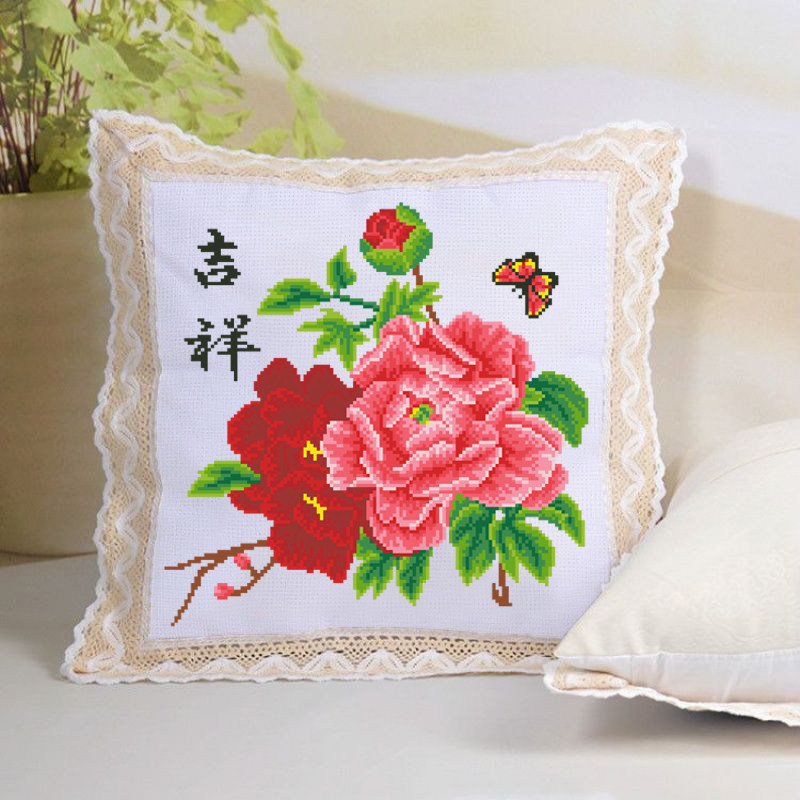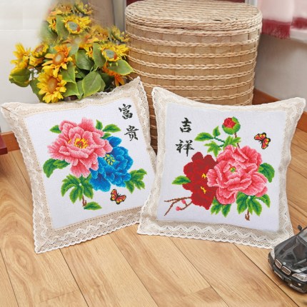 2025新款印花十字绣抱枕花开吉祥富贵牡丹图卡通沙发车靠垫自己绣