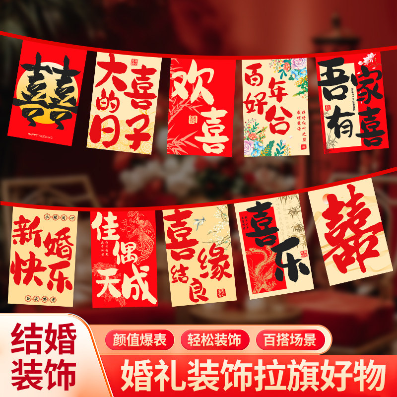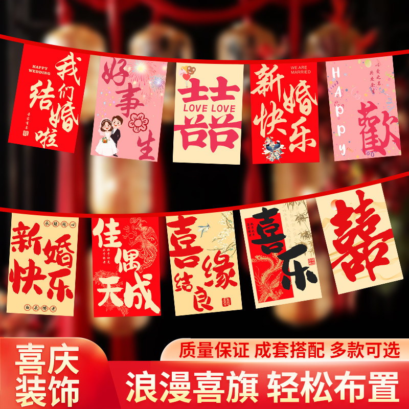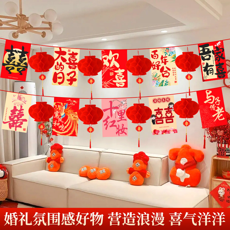结婚院子室外装饰喜字拉花挂旗彩旗串旗灯笼挂饰婚礼外景婚庆布置