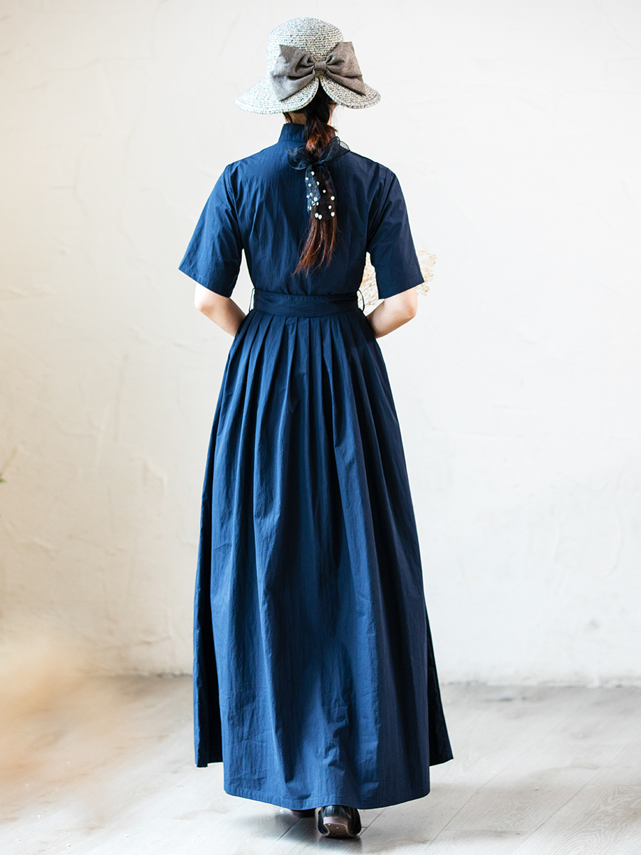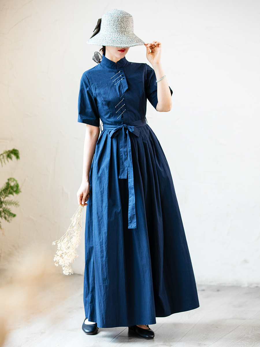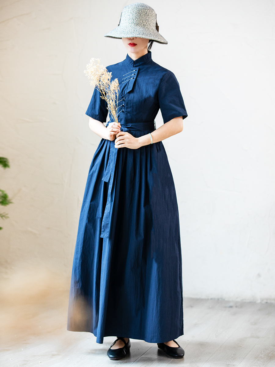 仙衣裾设计师藏蓝色连衣裙气质国风中式立领长裙修身显瘦大摆裙女