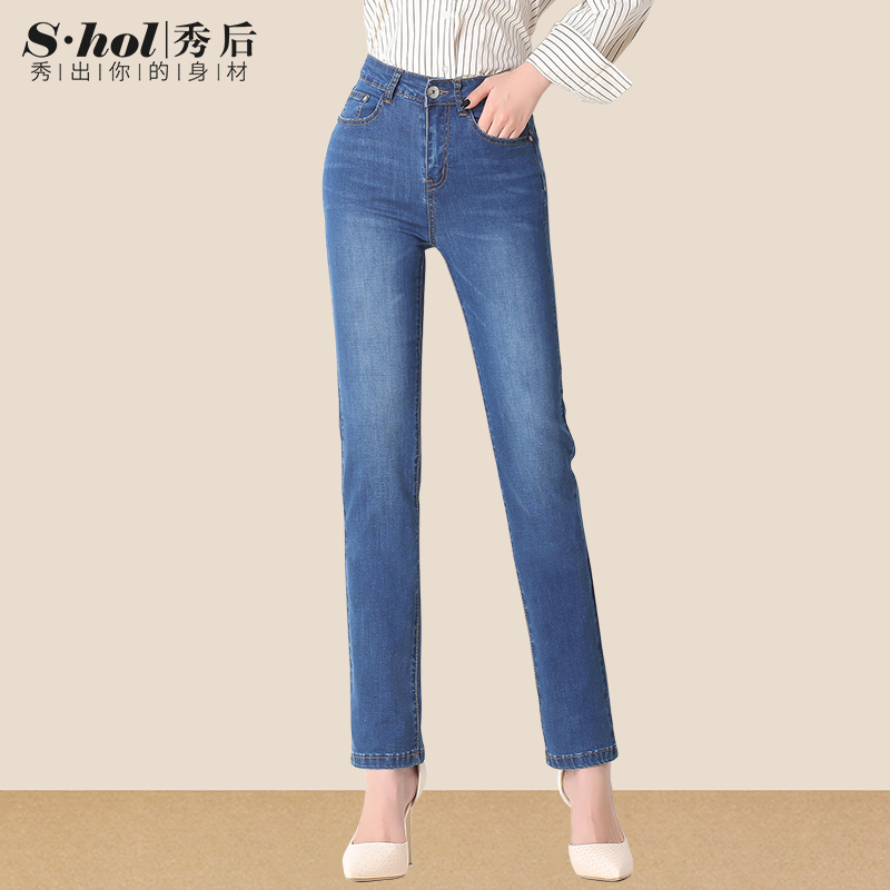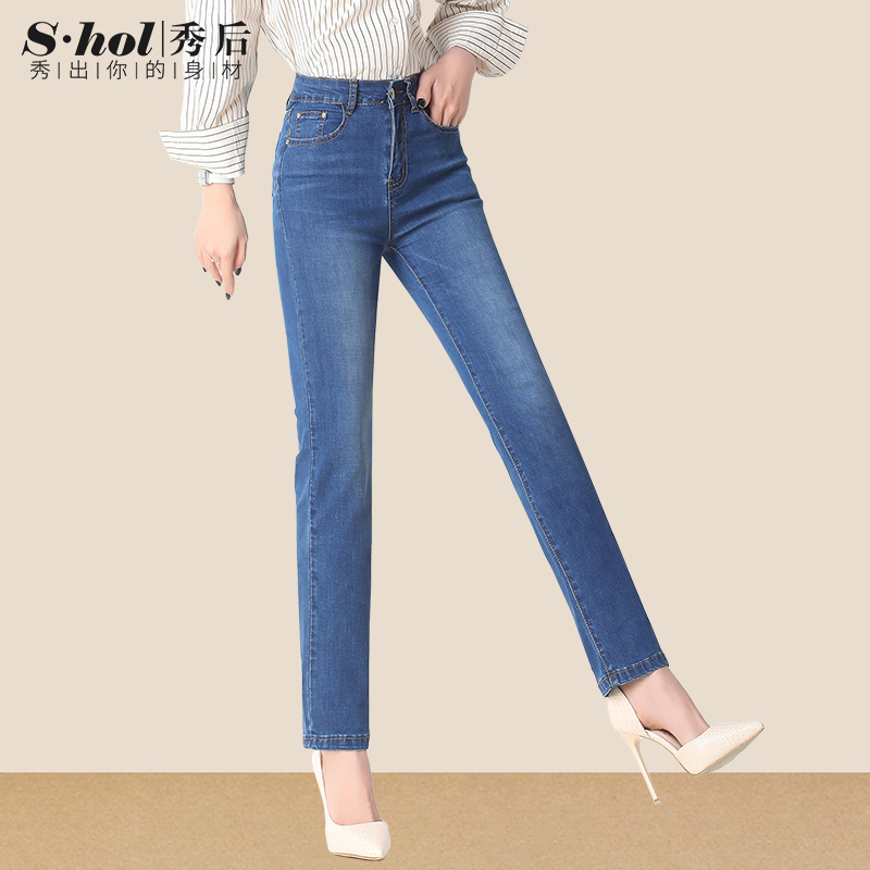 秀后夏天浅色裤子夏季薄款牛仔裤女高腰直筒裤长裤宽松大码胖女裤