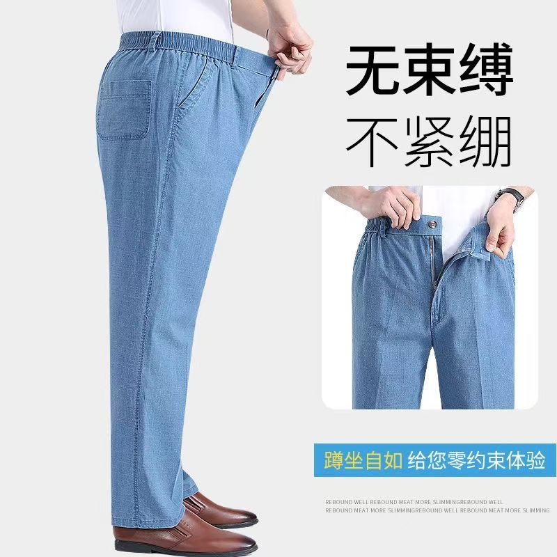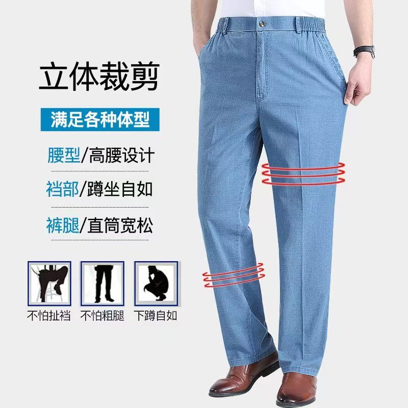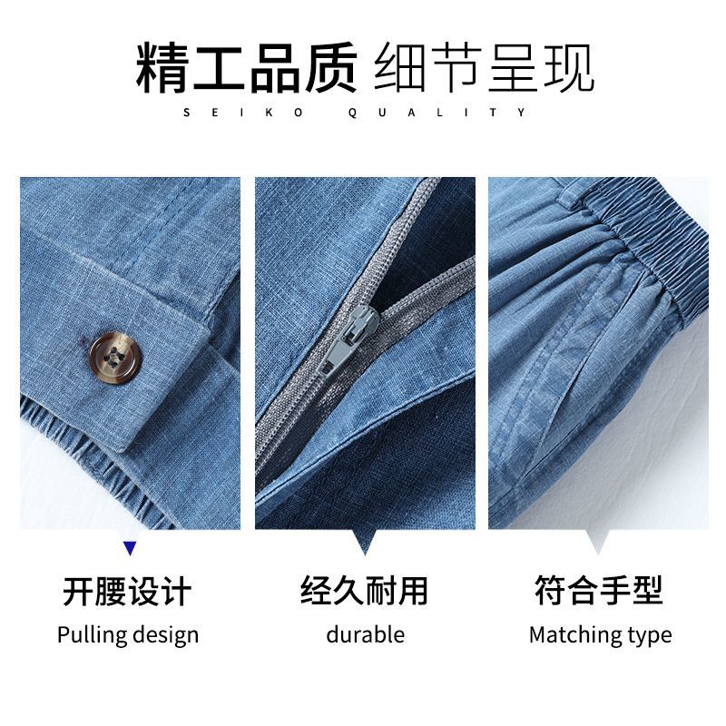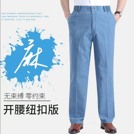 新款男士夏季棉麻休闲开腰长裤高腰深档薄款中老年宽松直筒爸爸裤