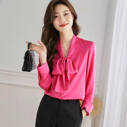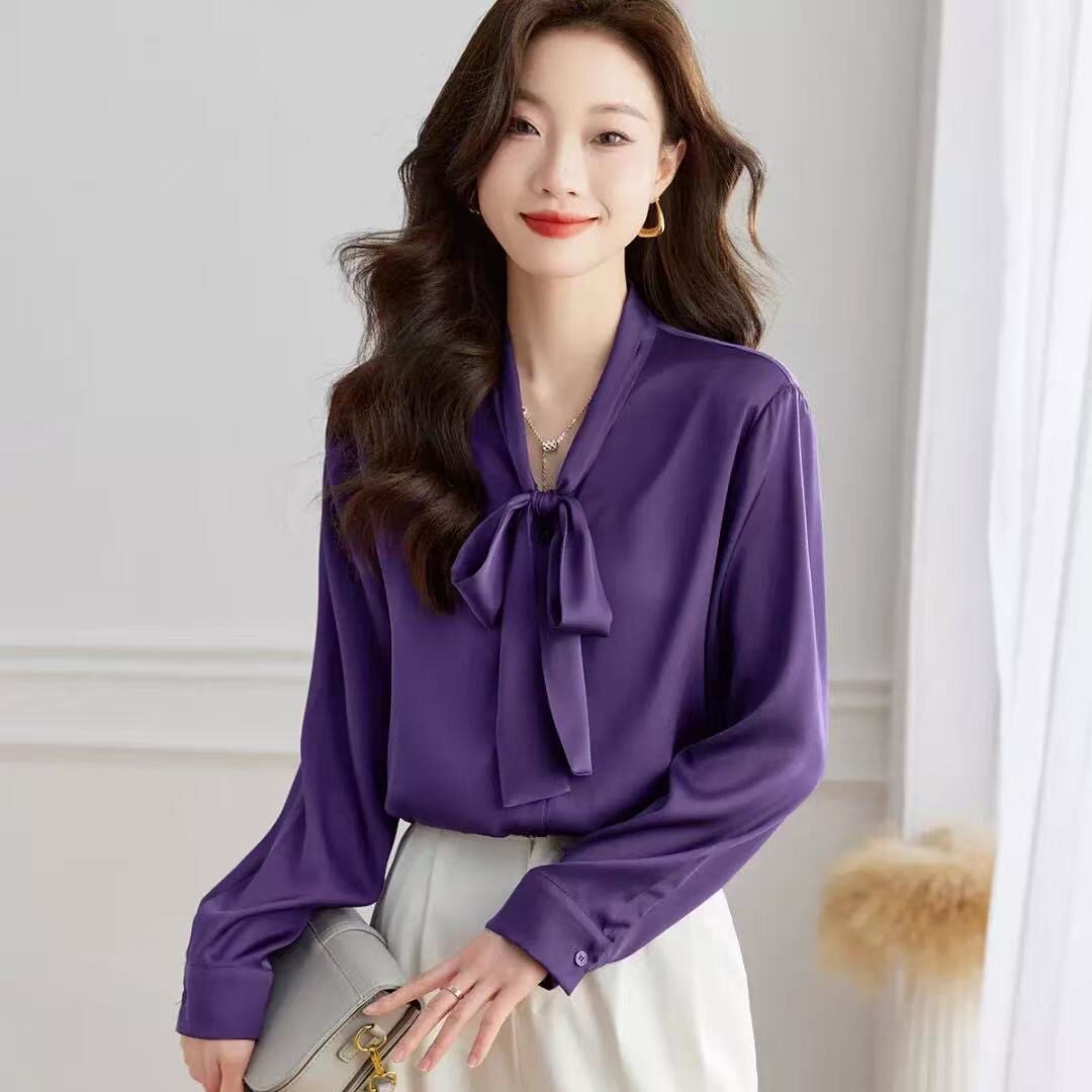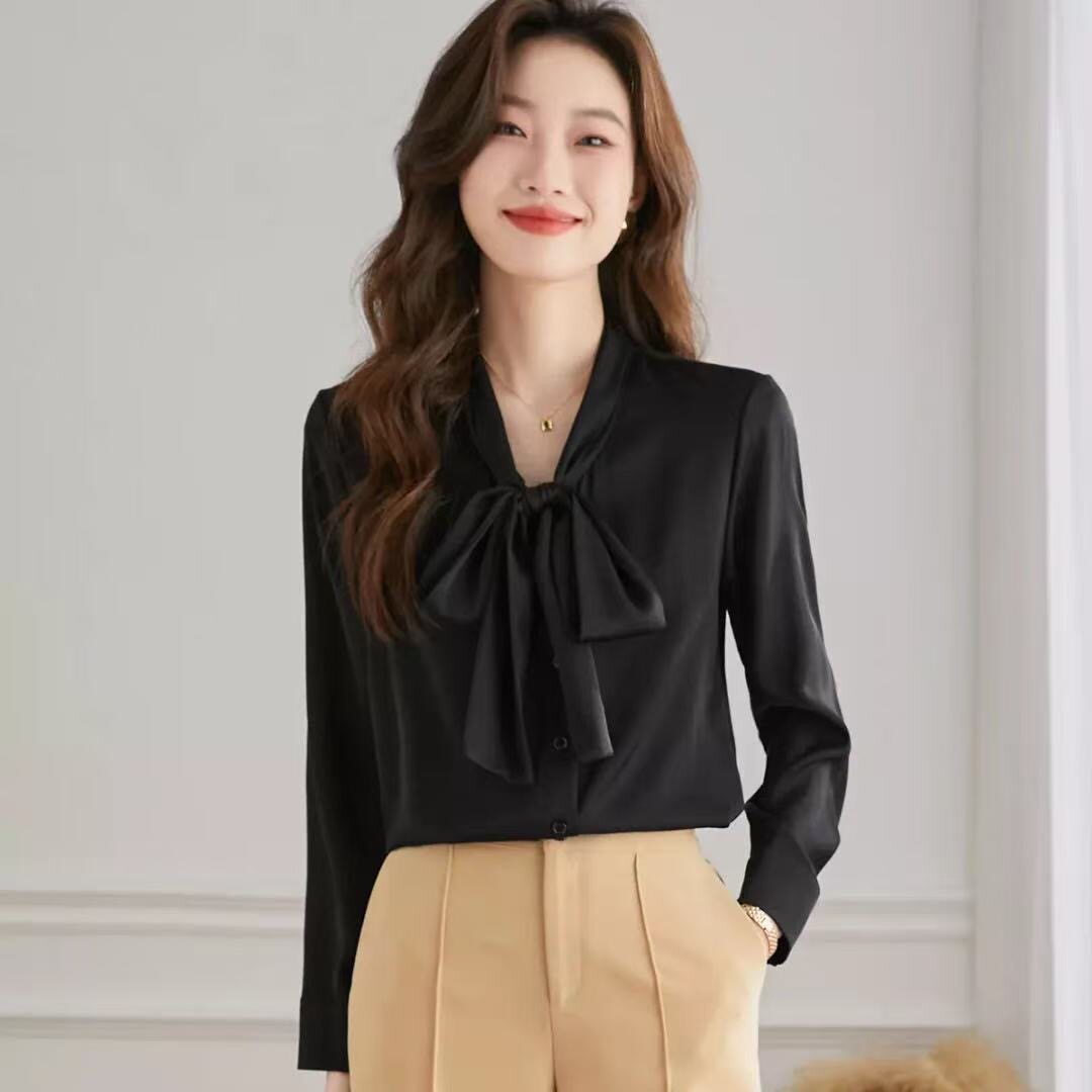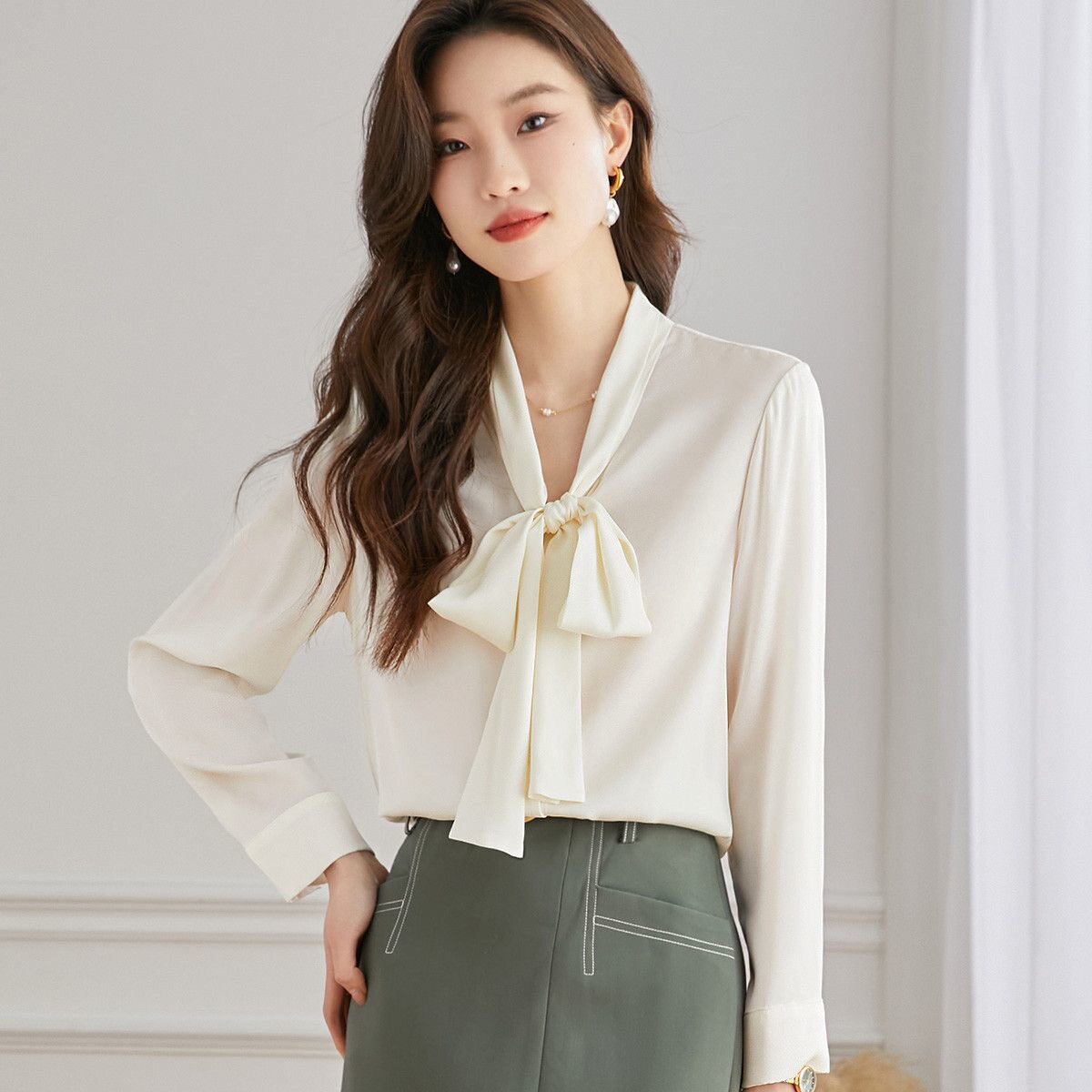 2026新款纯色真丝19姆米重磅衬衫女气质百搭宽松蝴蝶结飘带衬衣