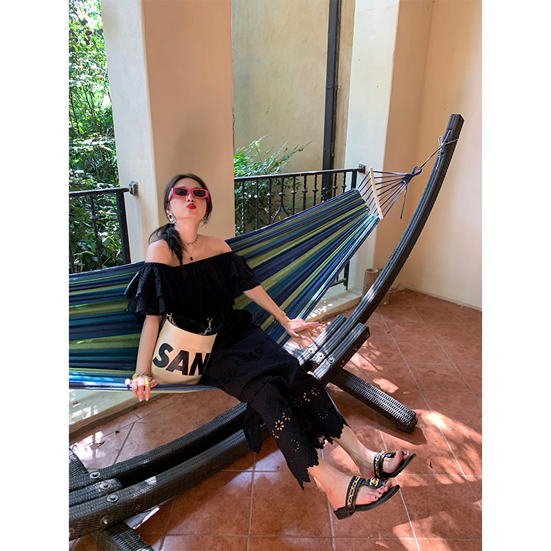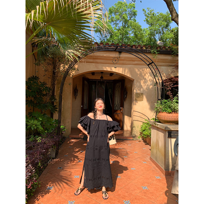 落落狷介 连衣裙2025新款女黑色蕾丝 一字肩蕾丝裙设计感小众长裙