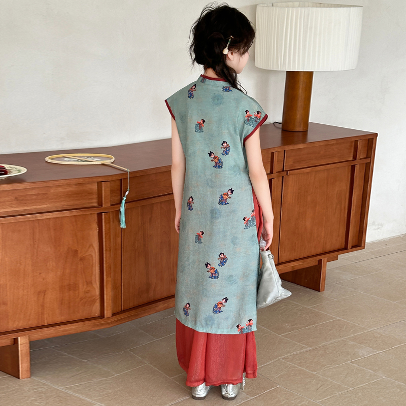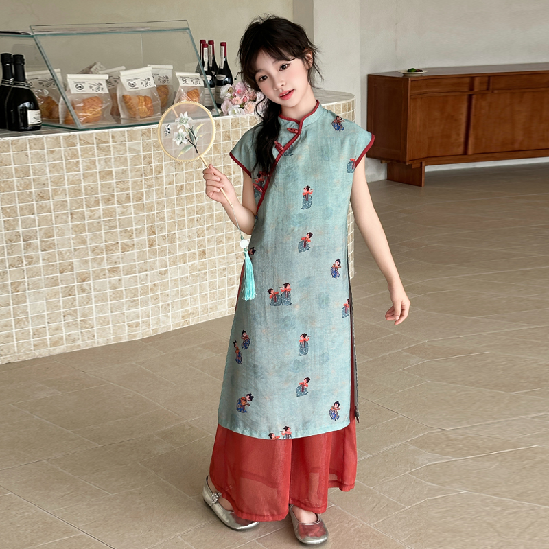 女童夏季中国风套装2025新款洋气女大童新中式旗袍裙阔腿裤两件套