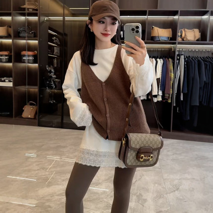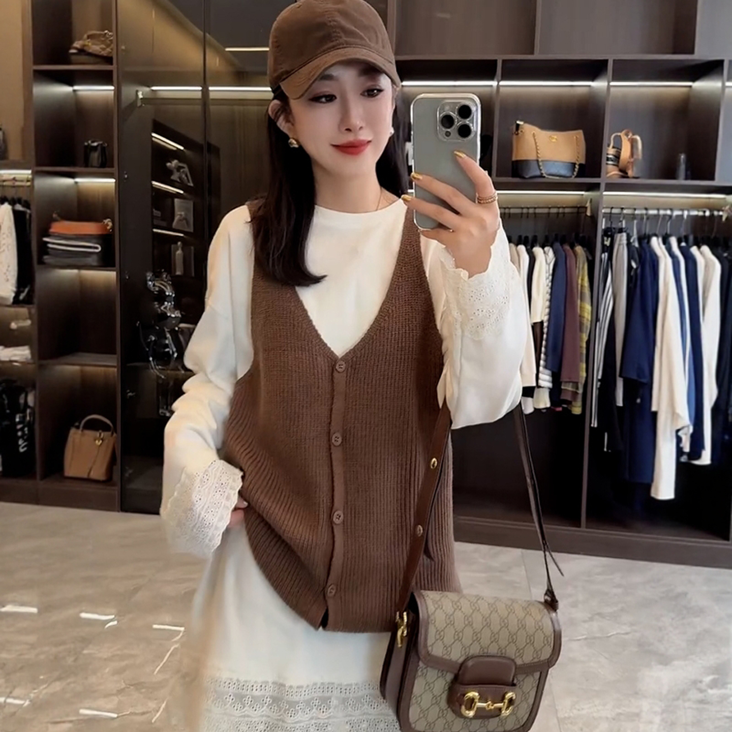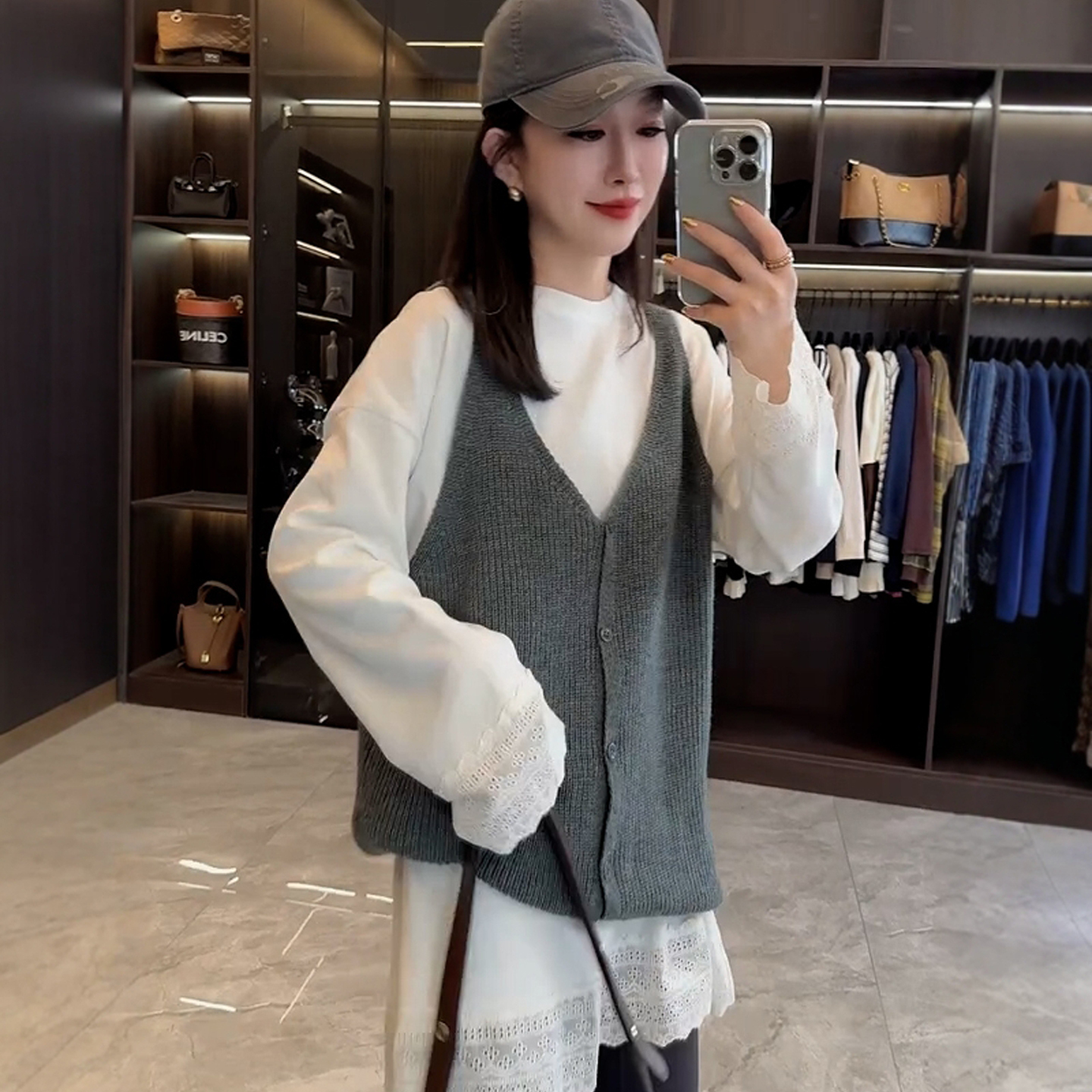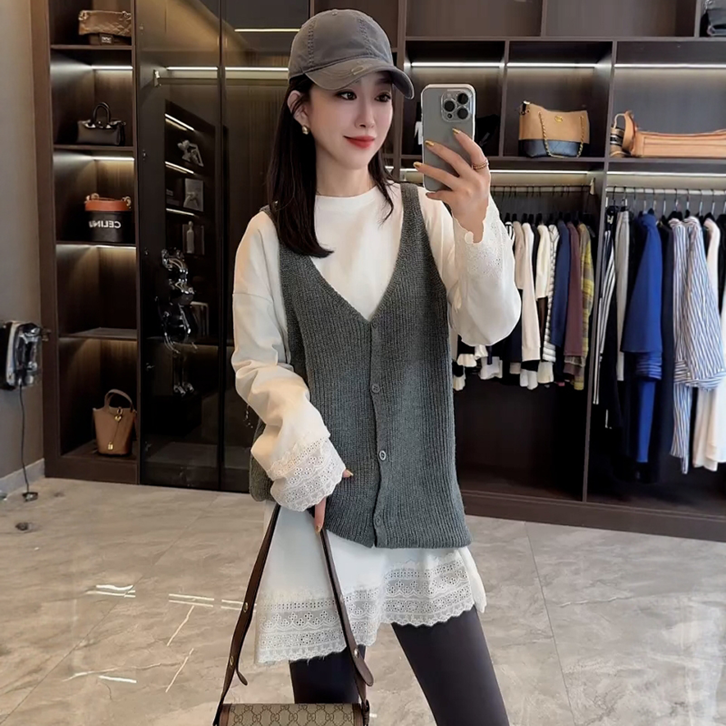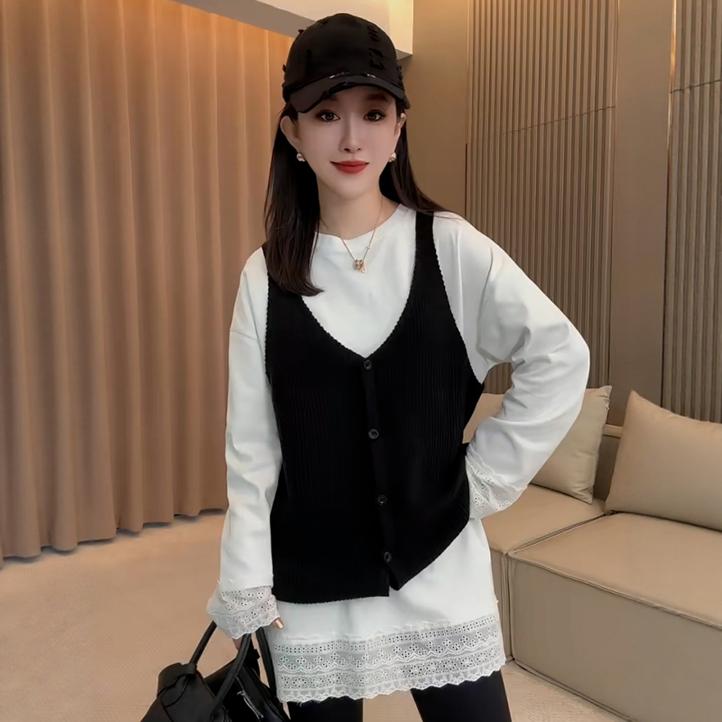2025秋冬季洋气高级感蕾丝拼接长袖t恤女叠穿针织马甲背心两件套