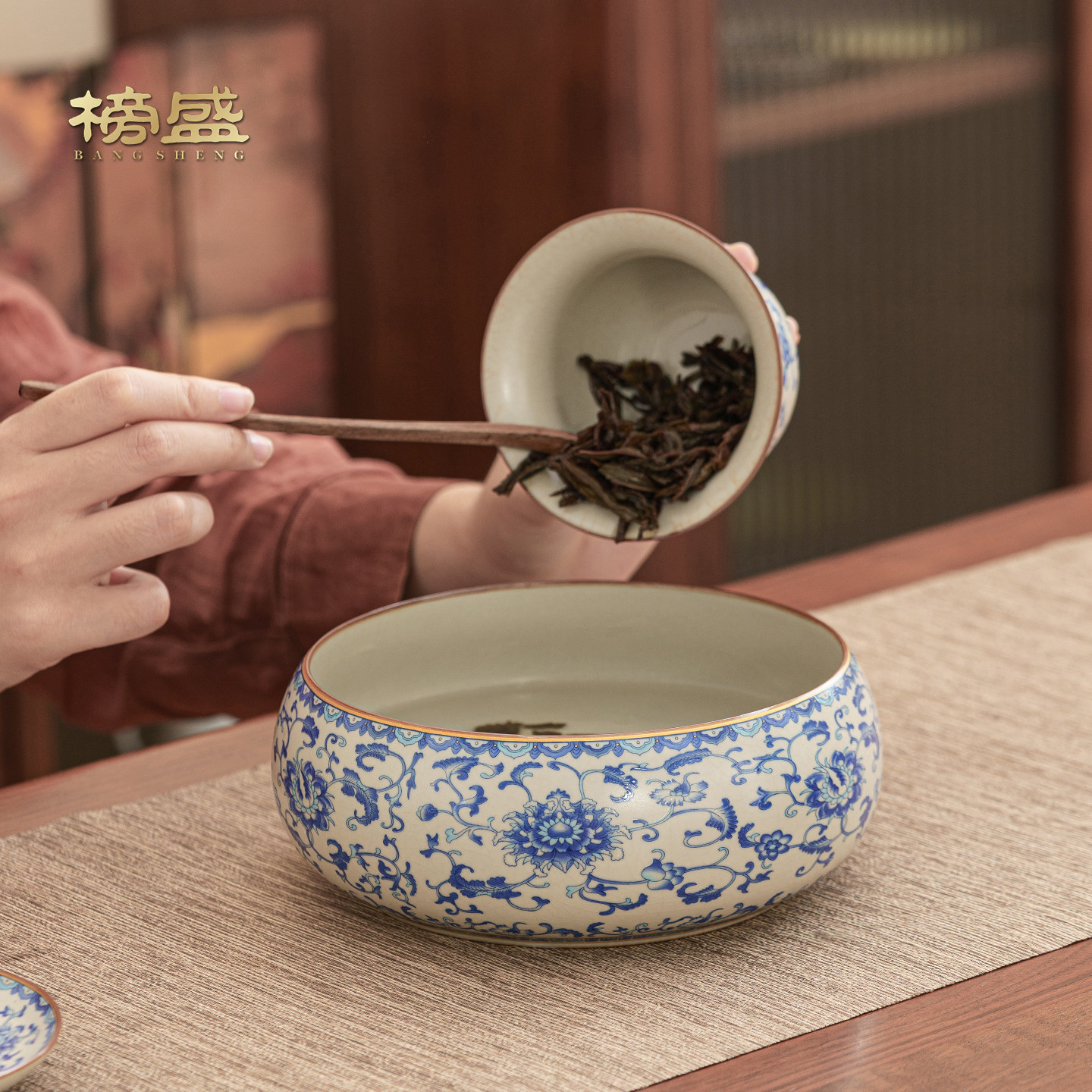 青花汝窑缠枝莲大容量茶洗家用茶杯收纳缸茶道零配建水陶瓷废水缸