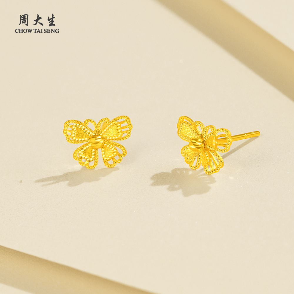 周大生黄18K金耳钉双层爆闪小仙蝶耳针蝴蝶耳饰生日礼物送女友