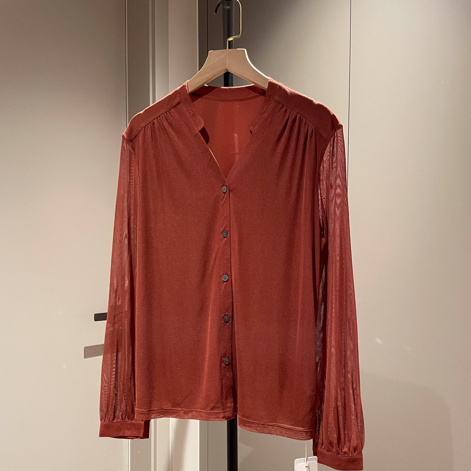 砖红V领网眼真丝针织长袖衬衫