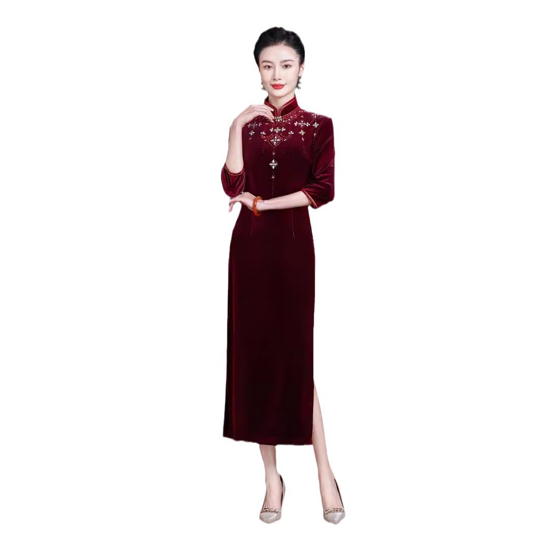 高档婚礼妈妈旗袍裙 奢华钉珠韩国绒旗袍 婚宴喜婆婆显瘦旗袍礼服