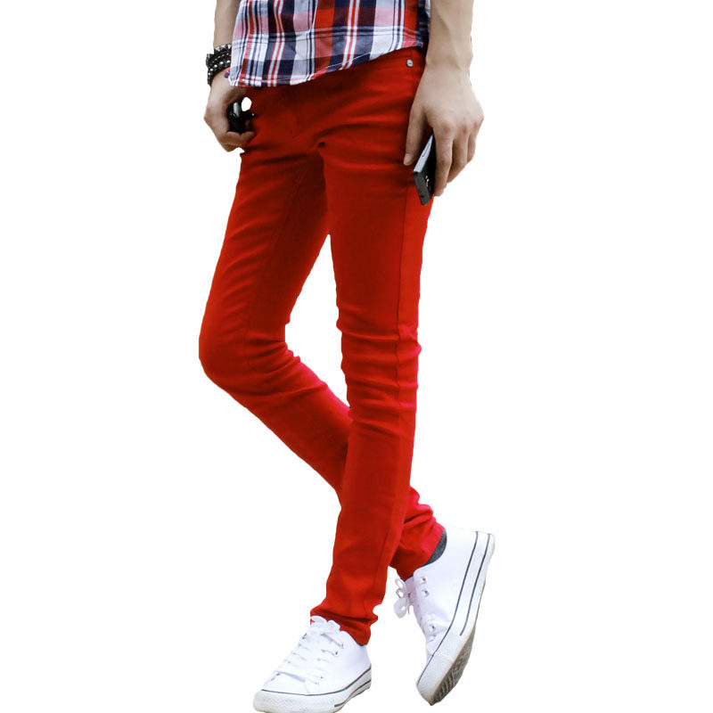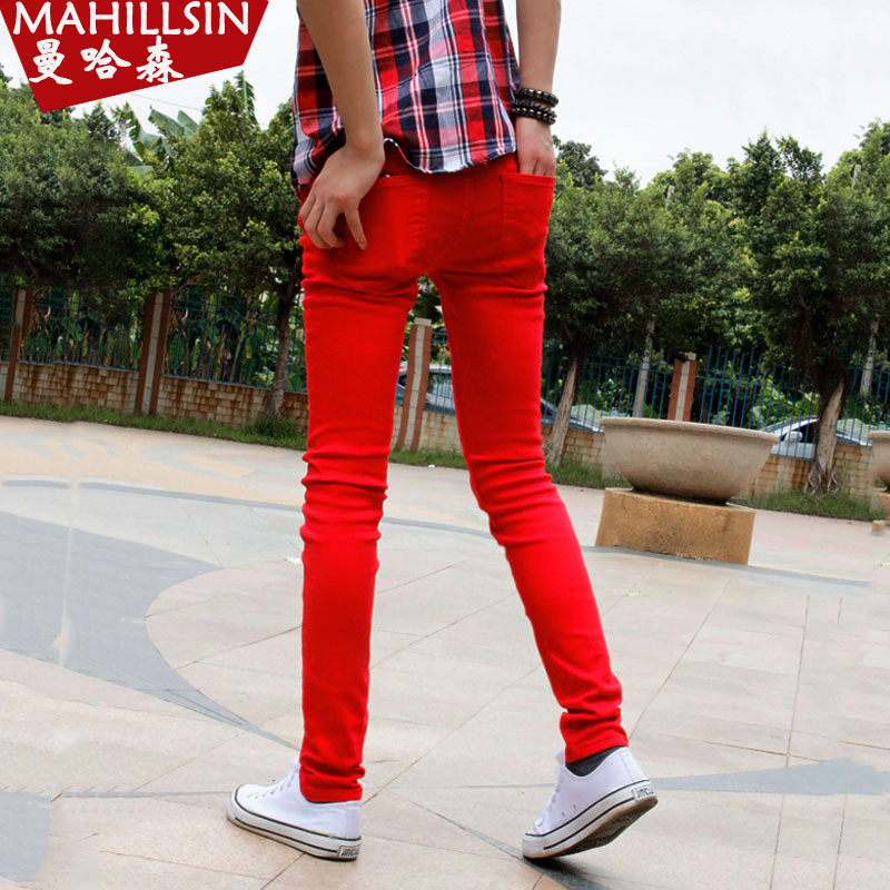 男士牛仔裤潮流秋季新款大红色修身韩版休闲棉弹小脚铅笔裤长裤子