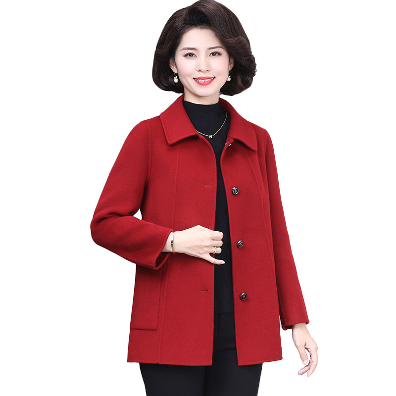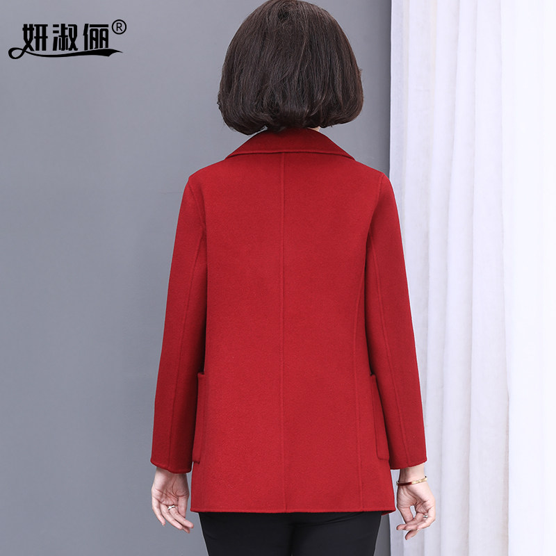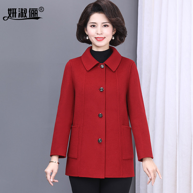 妈妈双面呢外套短款洋气新款中老年人女装秋冬季红色羊毛呢子大衣