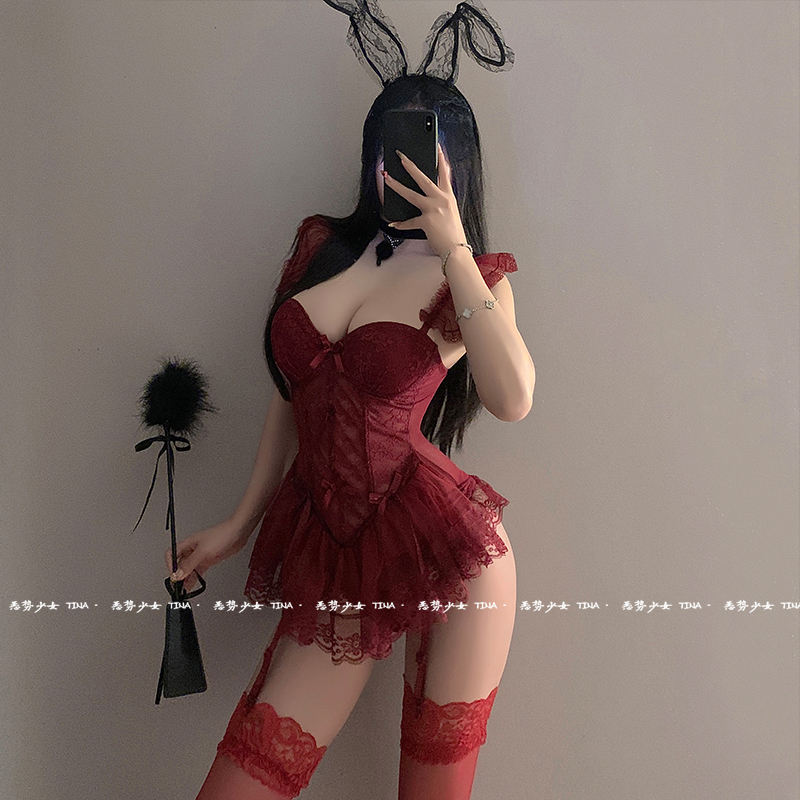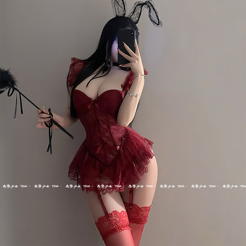 性感红色蕾丝鱼骨胸衣蝴蝶结纱裙