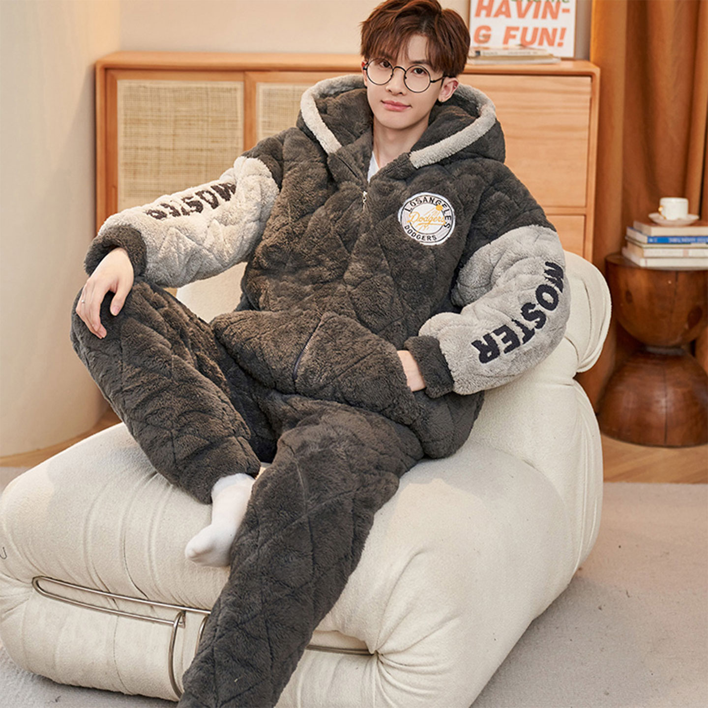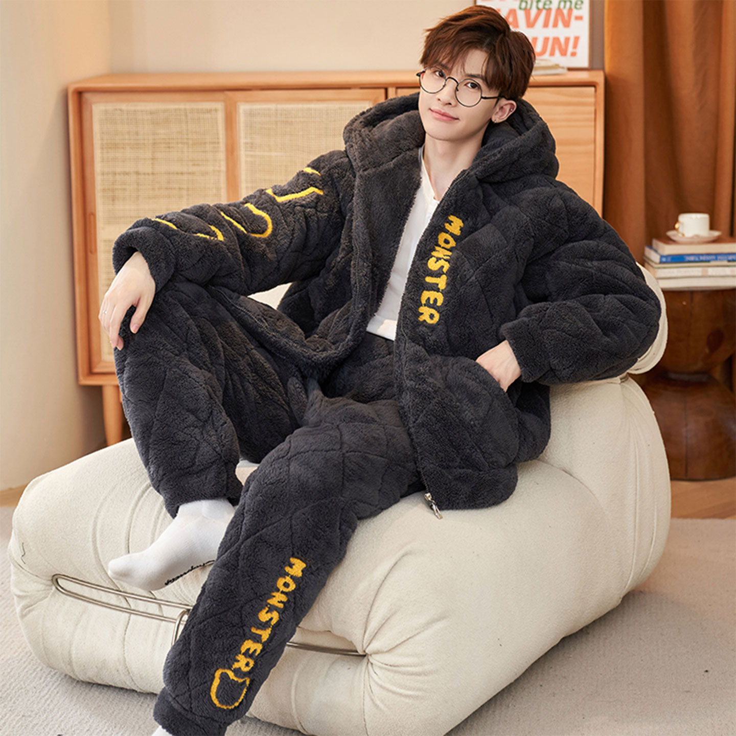 睡衣男冬季加厚加绒珊瑚绒三层夹棉冬天男士加大码保暖家居服套装