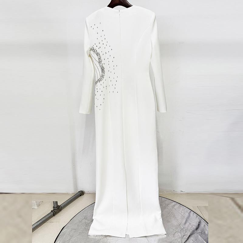 气质白色修身礼服2025新款气质重工钉珠镶钻长袖长款连衣裙长裙
