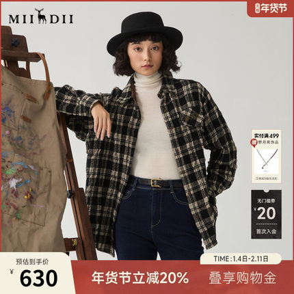 谜底黑白格子衬衫长袖女冬季新品宽松羊毛混纺衬衣244GC1484