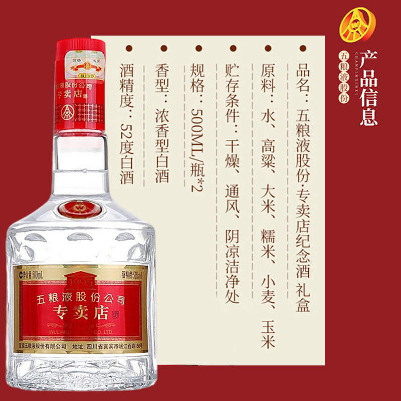 【下拉享优惠】五粮液1995专卖店52度浓香型白酒500ml*1瓶送礼