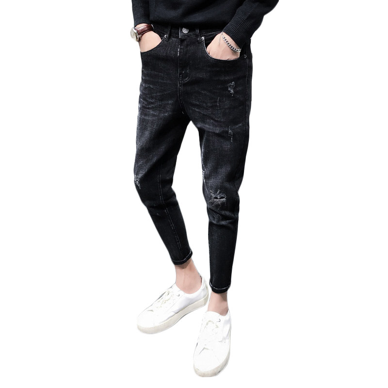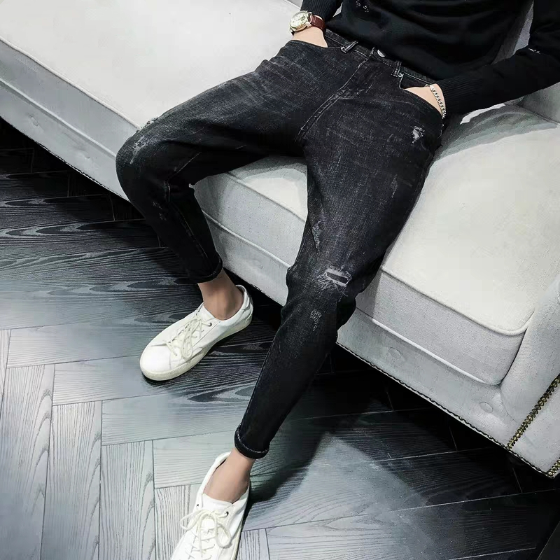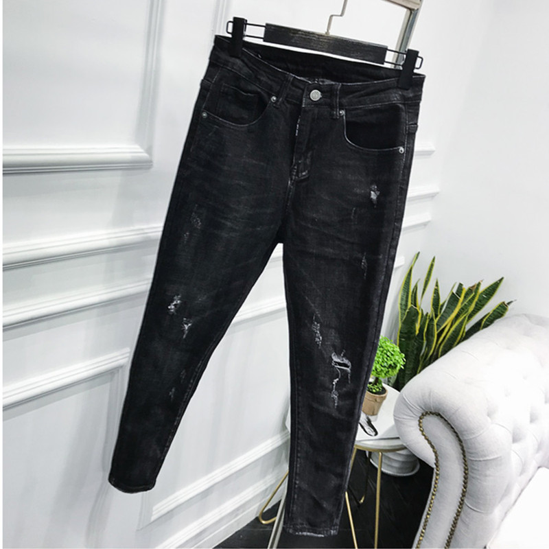 黑色牛仔裤男破洞九分裤秋冬2025年潮流韩版长裤弹力修身小脚裤