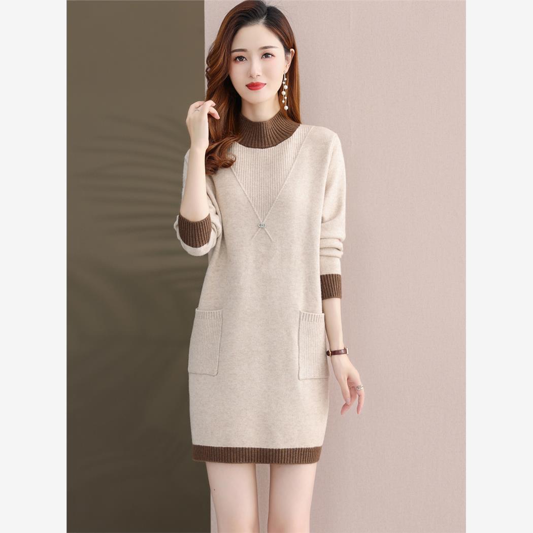半高领毛衣女士连衣裙新款大款拼色中长款遮屁股洋气打底衫秋冬季