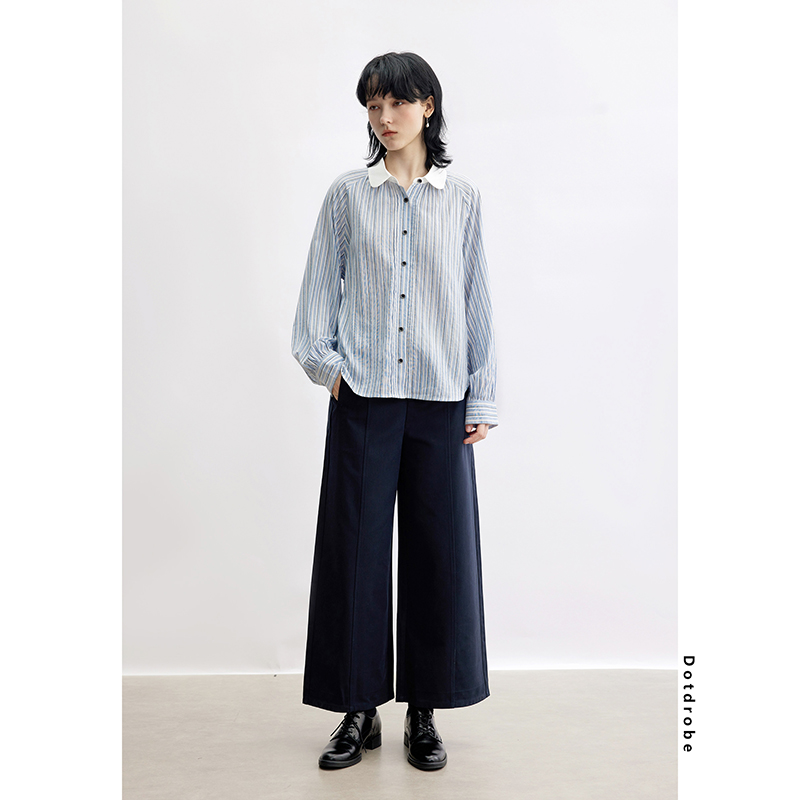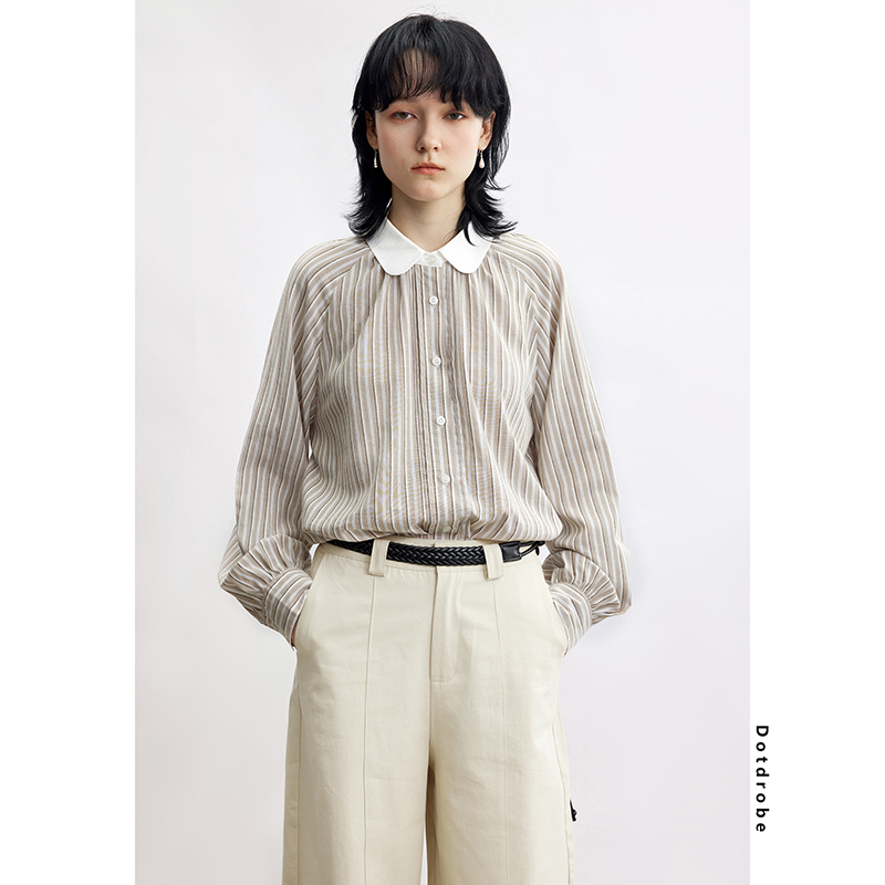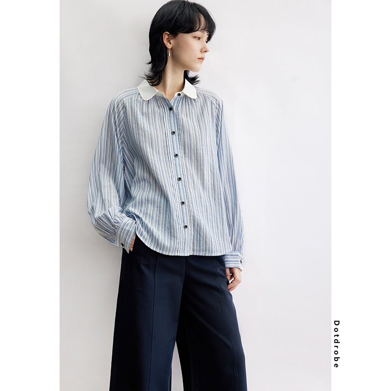 Dotdrobe多着 日系轻薄款 撞色元宝领纯棉条纹长袖衬衫女-两色入