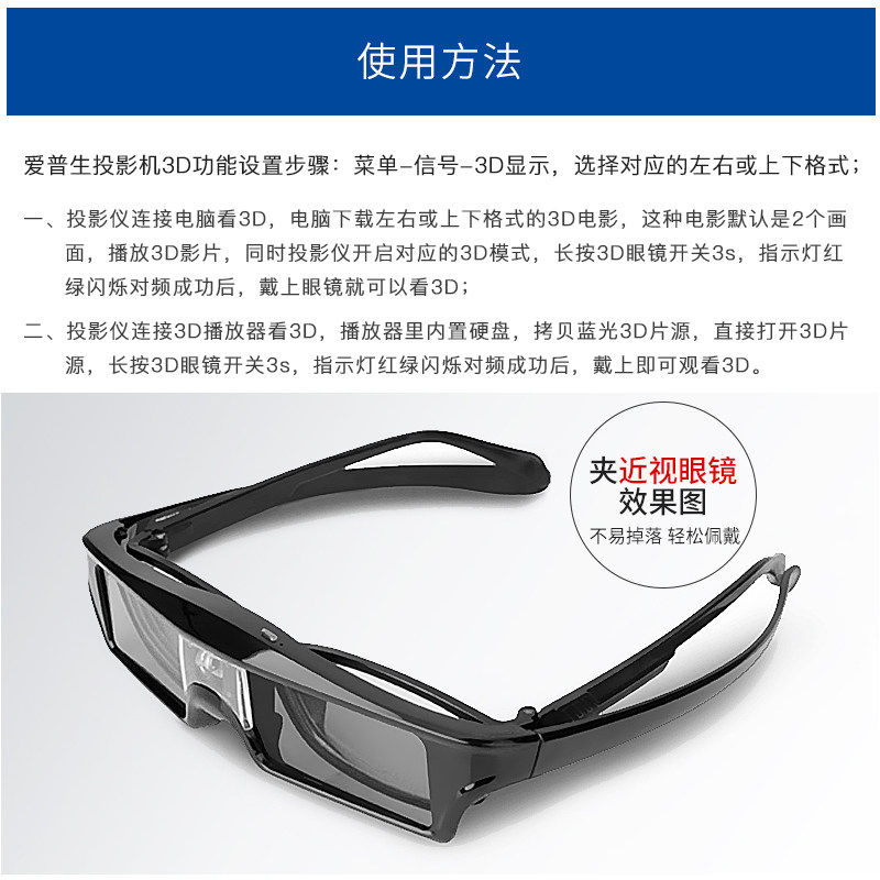 爱普生投影机3D眼镜主动快门式家庭影院蓝光投影仪专用套近视眼镜充电式儿童极米坚果宏基索尼奥图码明基原装