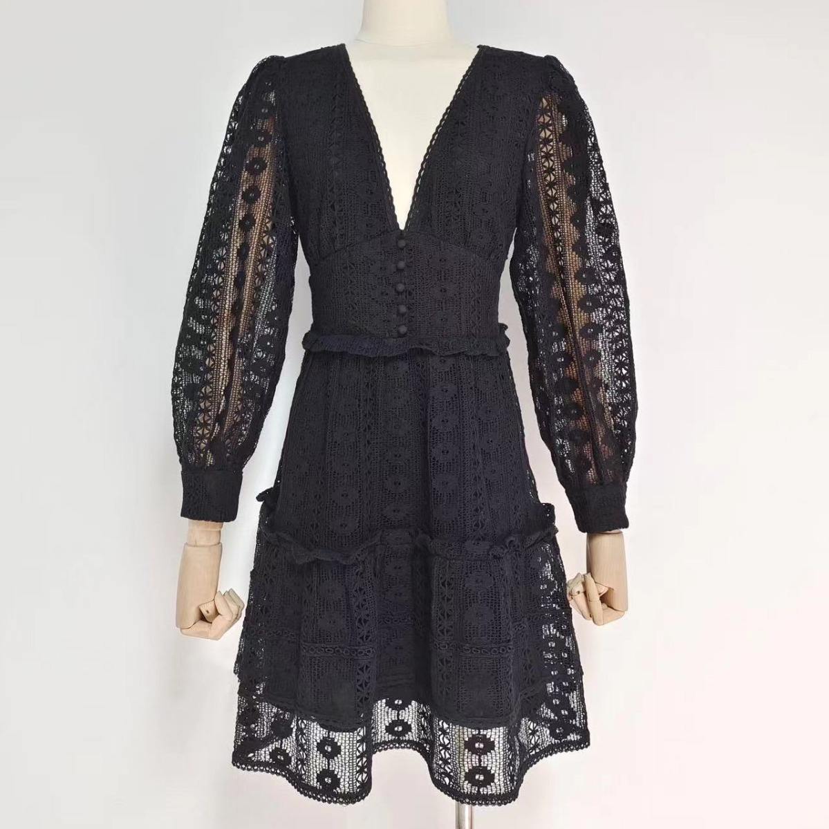 澳洲小众外贸早春秋V领长袖收腰镂空短款连衣裙女基本款涤纶单件