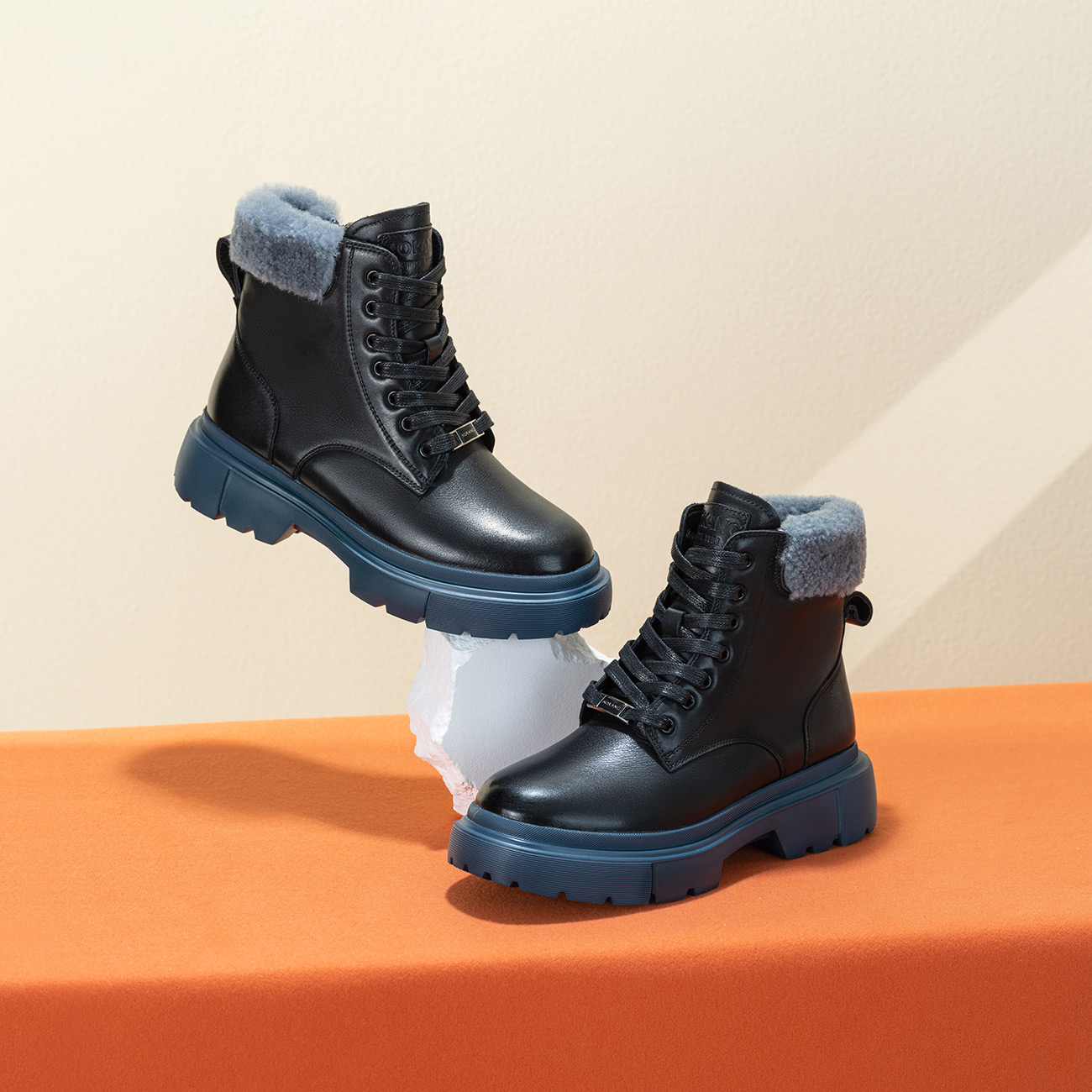 【运动皮鞋】奥康女鞋冬季款真皮复古小个子短靴厚底毛口马丁靴