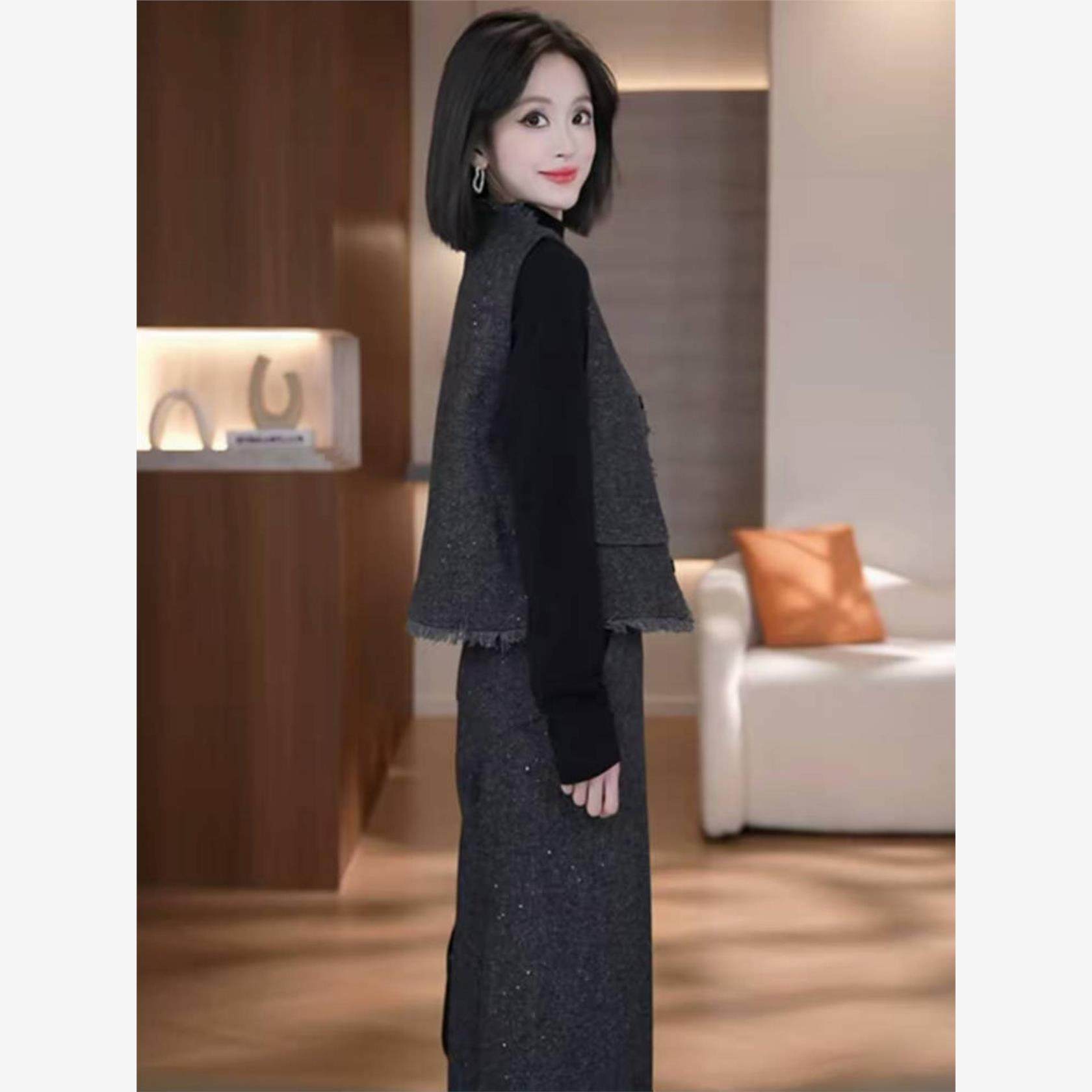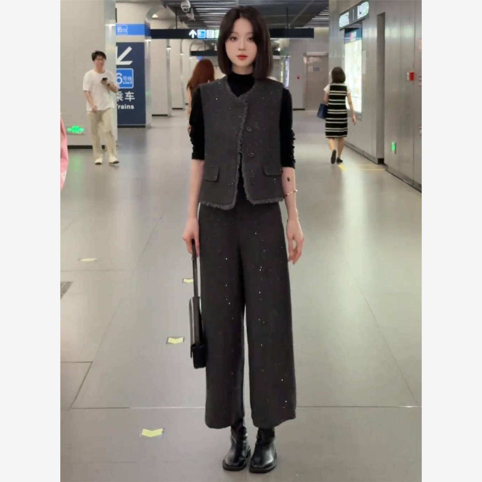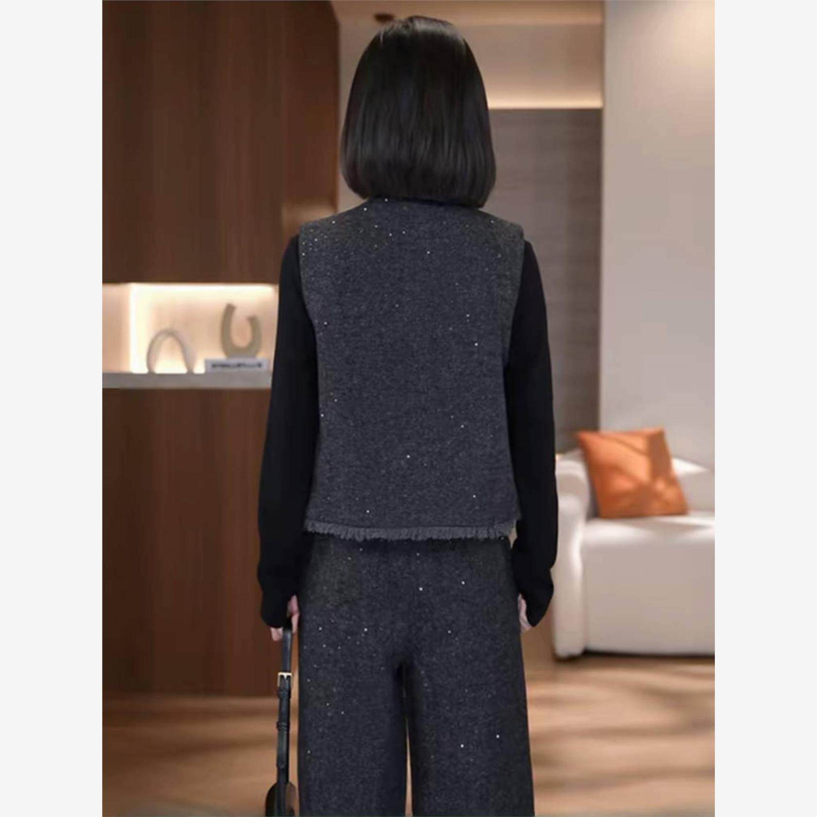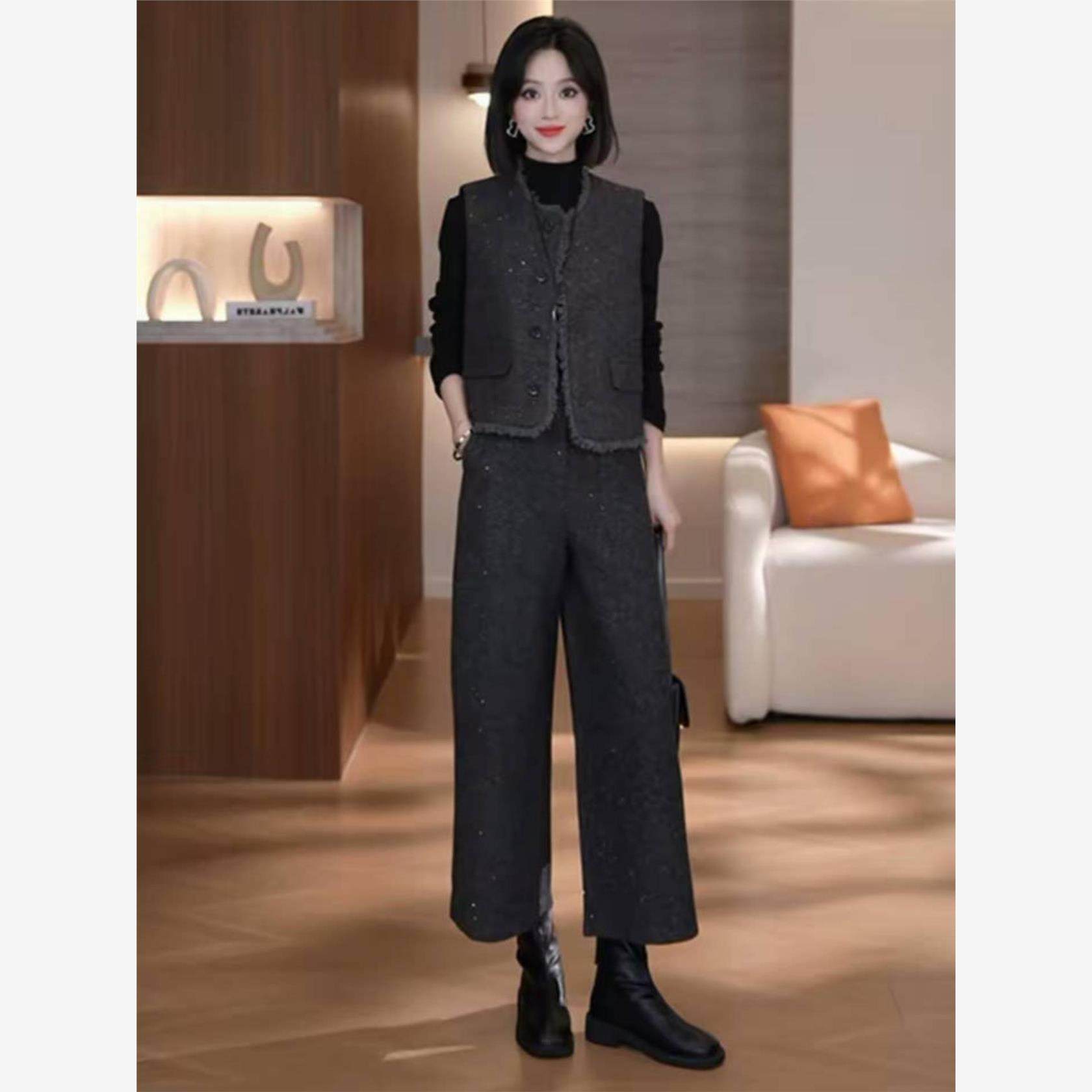 小香风时尚套装女士洋气质无袖马甲长袖打底衫阔腿裤名媛风三件套