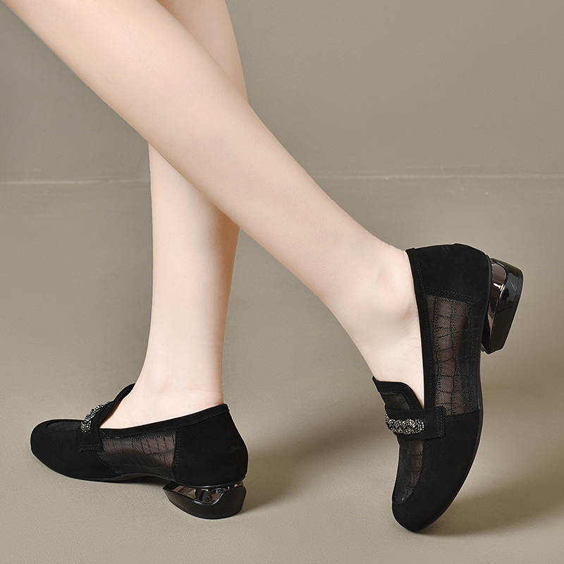 真皮网纱单鞋女2025新款夏季圆头平底皮鞋镂空透气豆豆鞋妈妈凉鞋