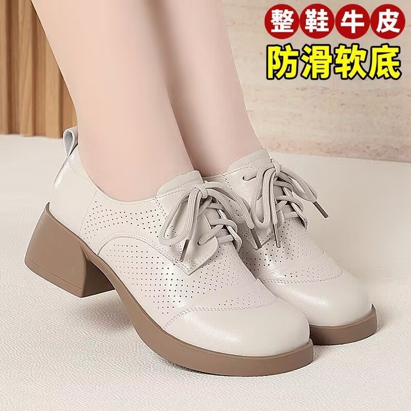 中老年妈妈皮鞋真皮女士凉鞋女款夏季镂空女鞋中跟单鞋真皮洞洞鞋