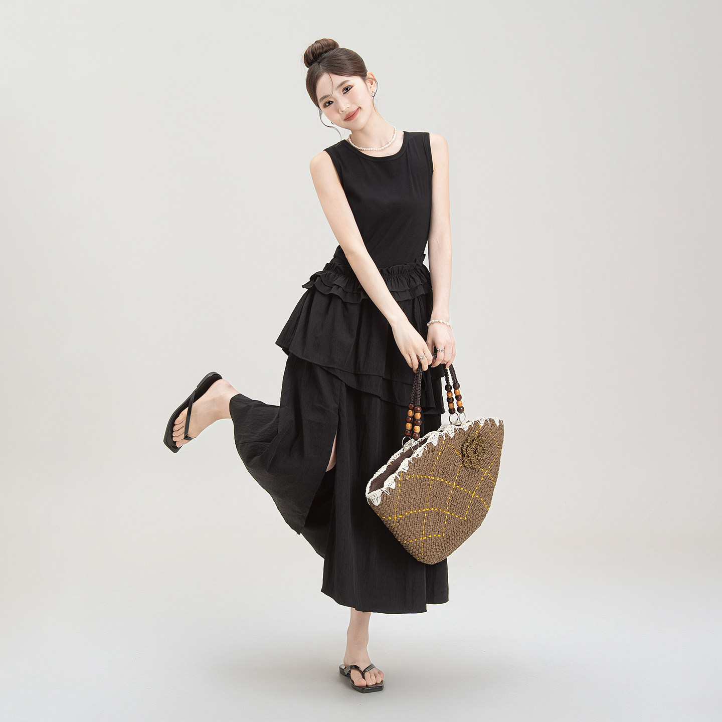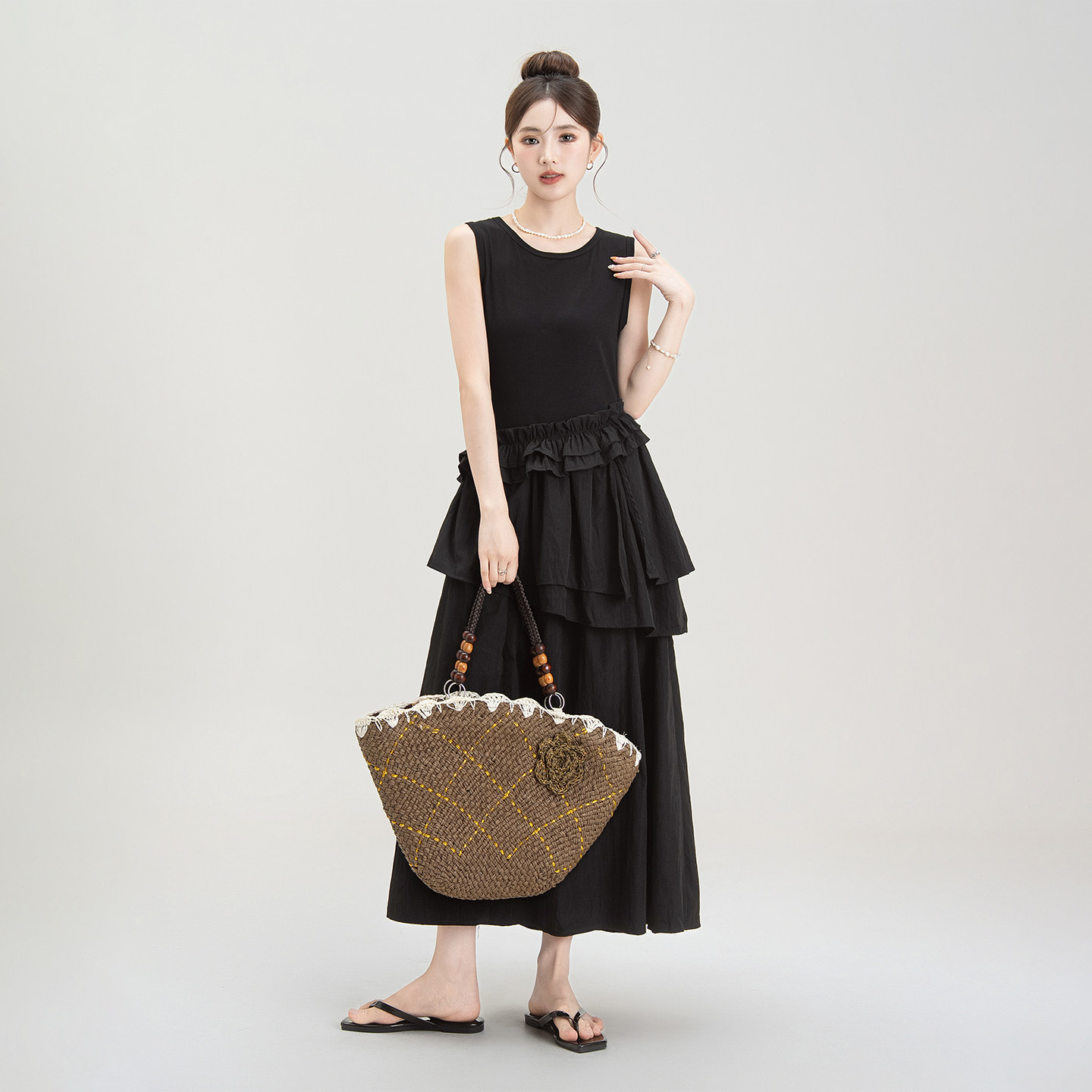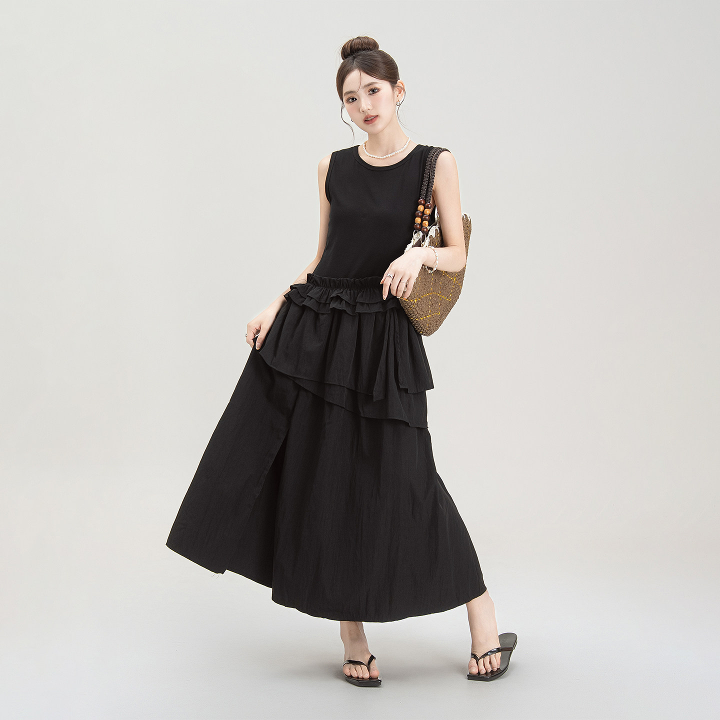 黑色法式不规则荷叶边无袖背心连衣裙女夏季新款下摆拼接收腰长裙