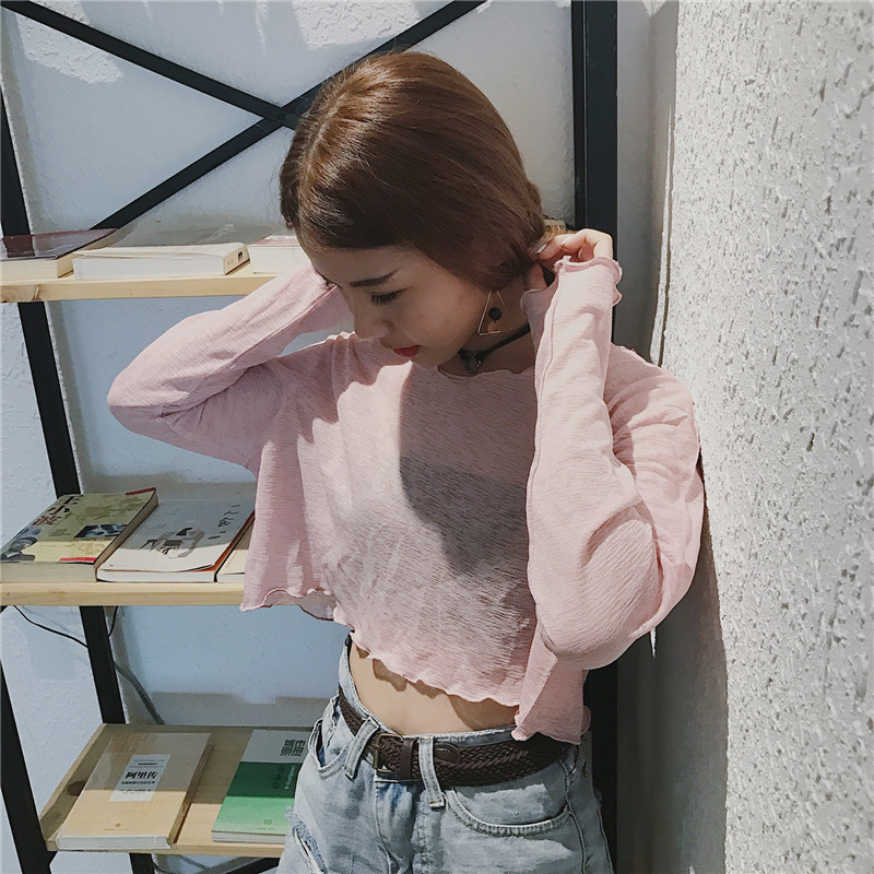 露脐春装女现代街舞爵士舞服装 港味chic纯色短款透视长袖T恤上衣
