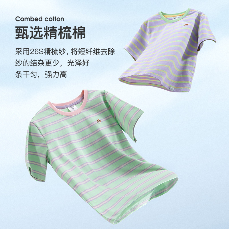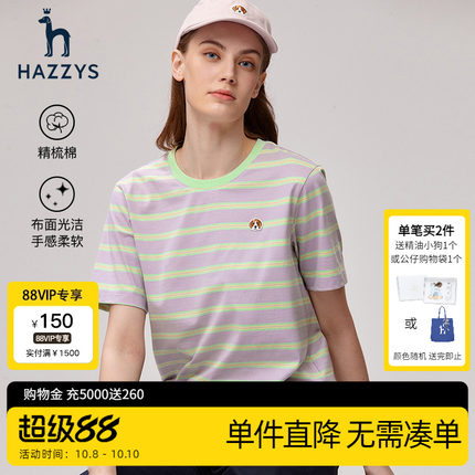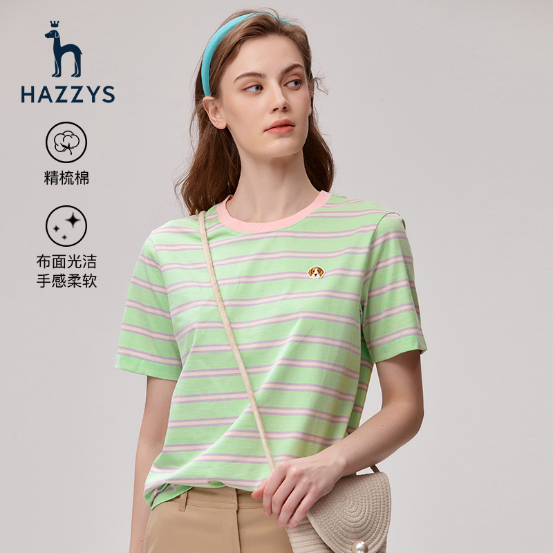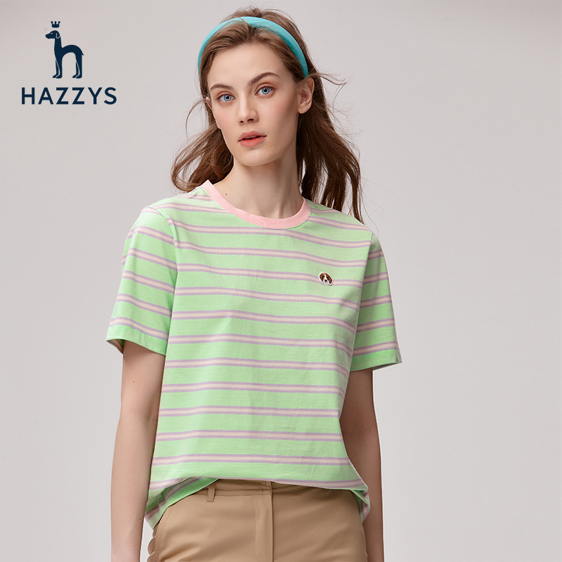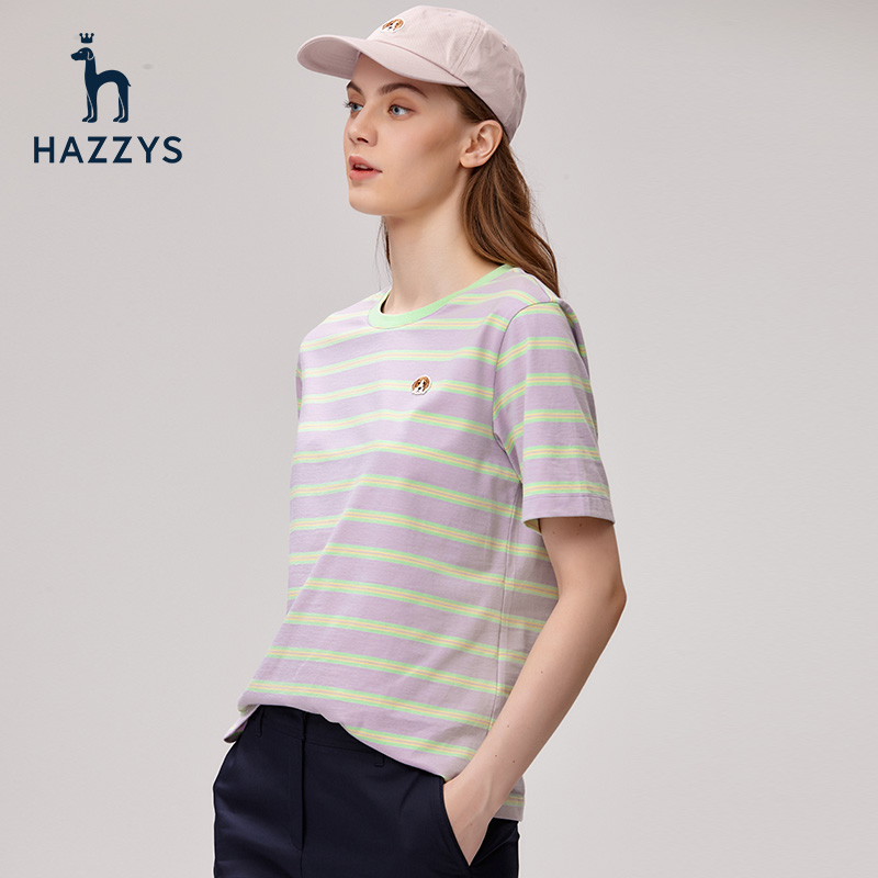 Hazzys哈吉斯条纹圆领短袖T恤女士夏季休闲纯棉体恤时尚宽松上衣