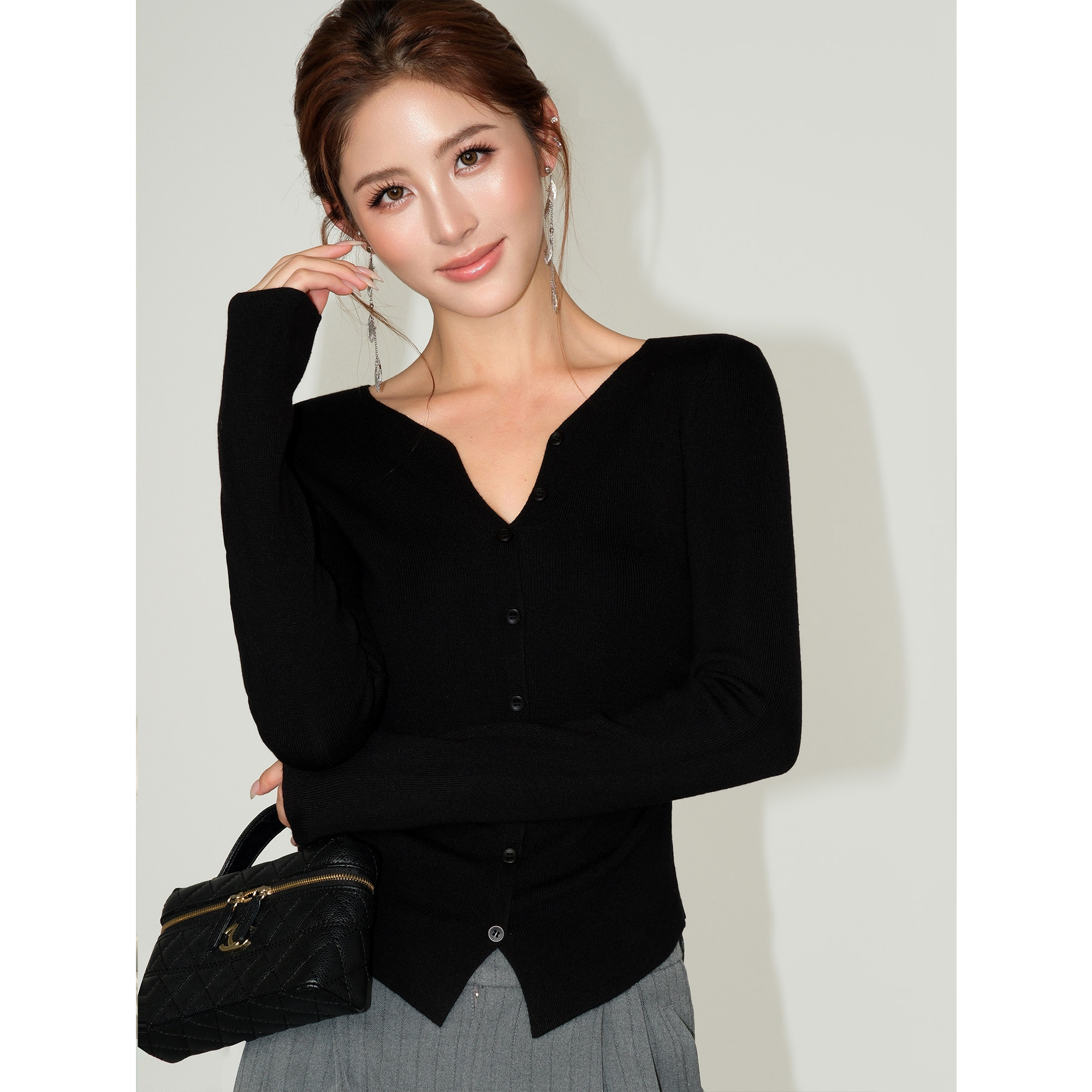 NEVA HU 极简share 柔软V领短款针织开衫女气质修身收褶长袖上衣