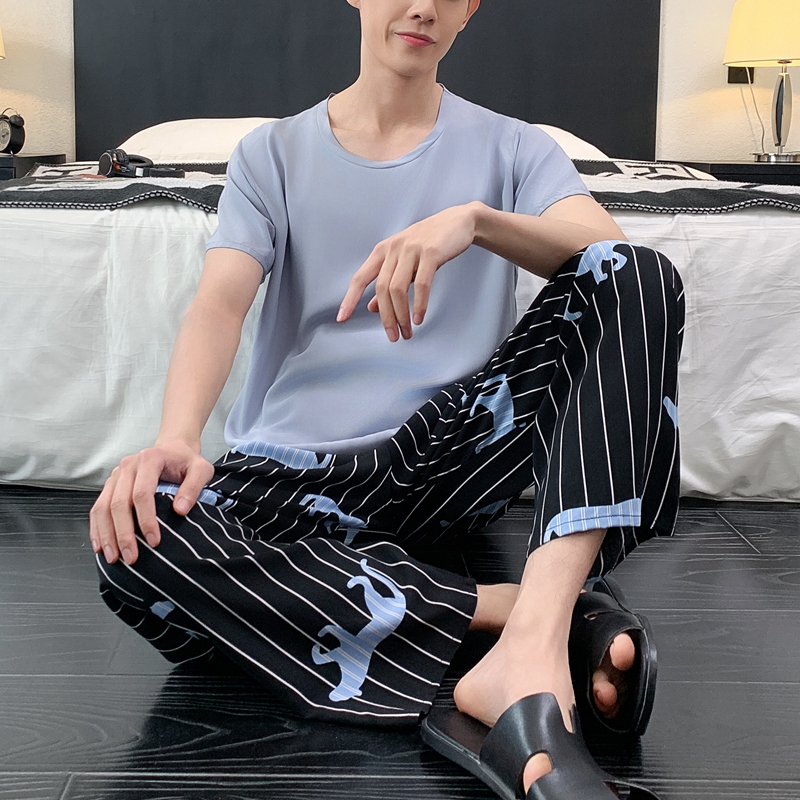 男士睡衣夏季棉绸短袖人造棉绵绸家居服薄款宽松极简风套装两件套