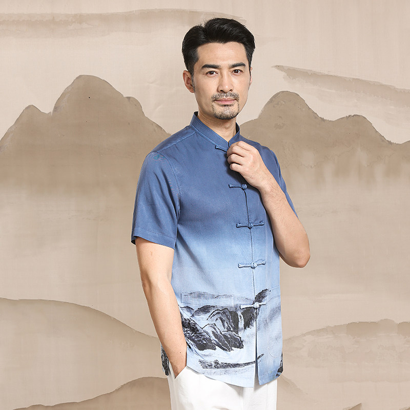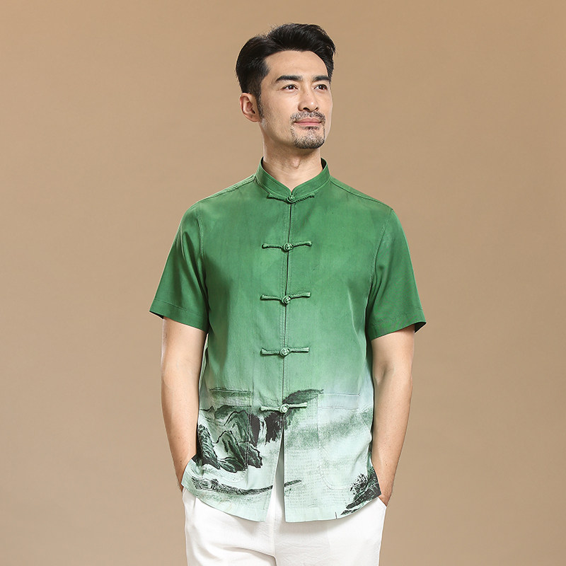 中式唐装男夏季短袖中老年休闲立领盘扣衬衫中国风薄款中山装上衣