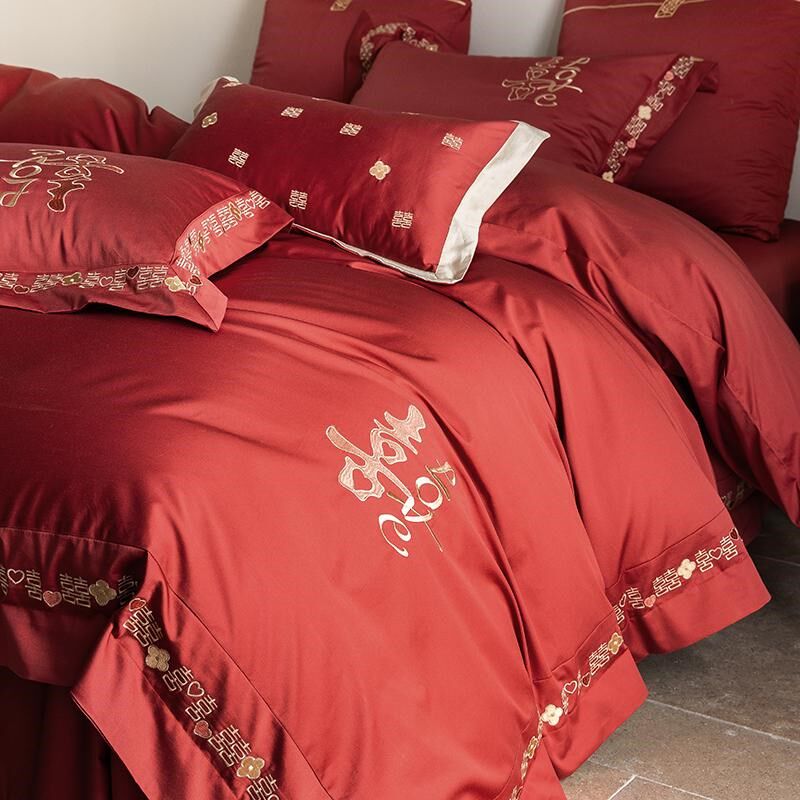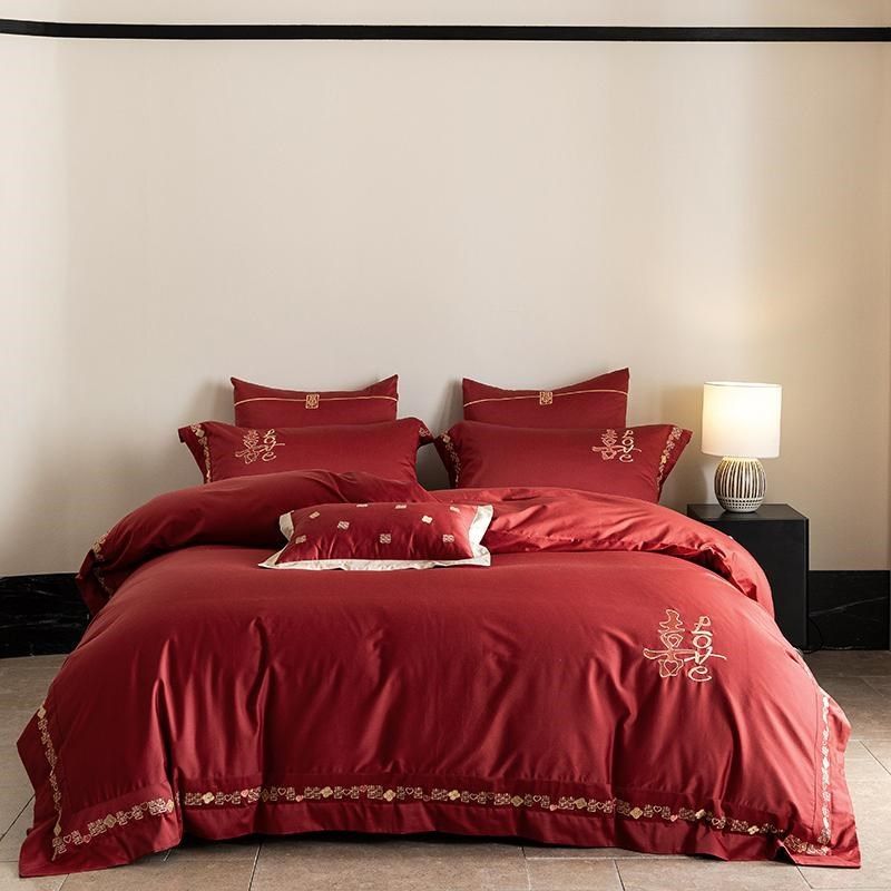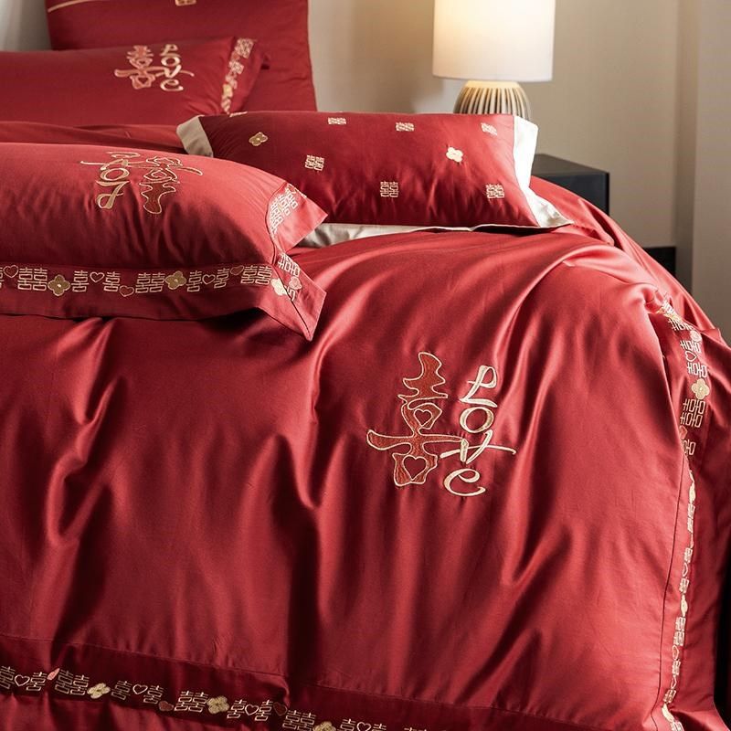 高级感喜字刺绣全棉长绒棉四件套红色中式被套床单结婚房床品