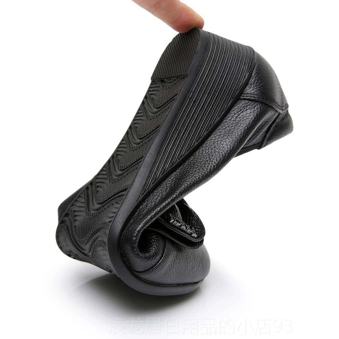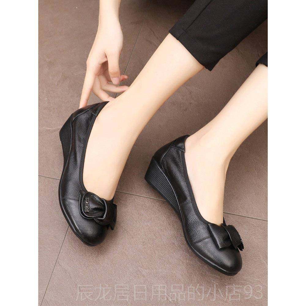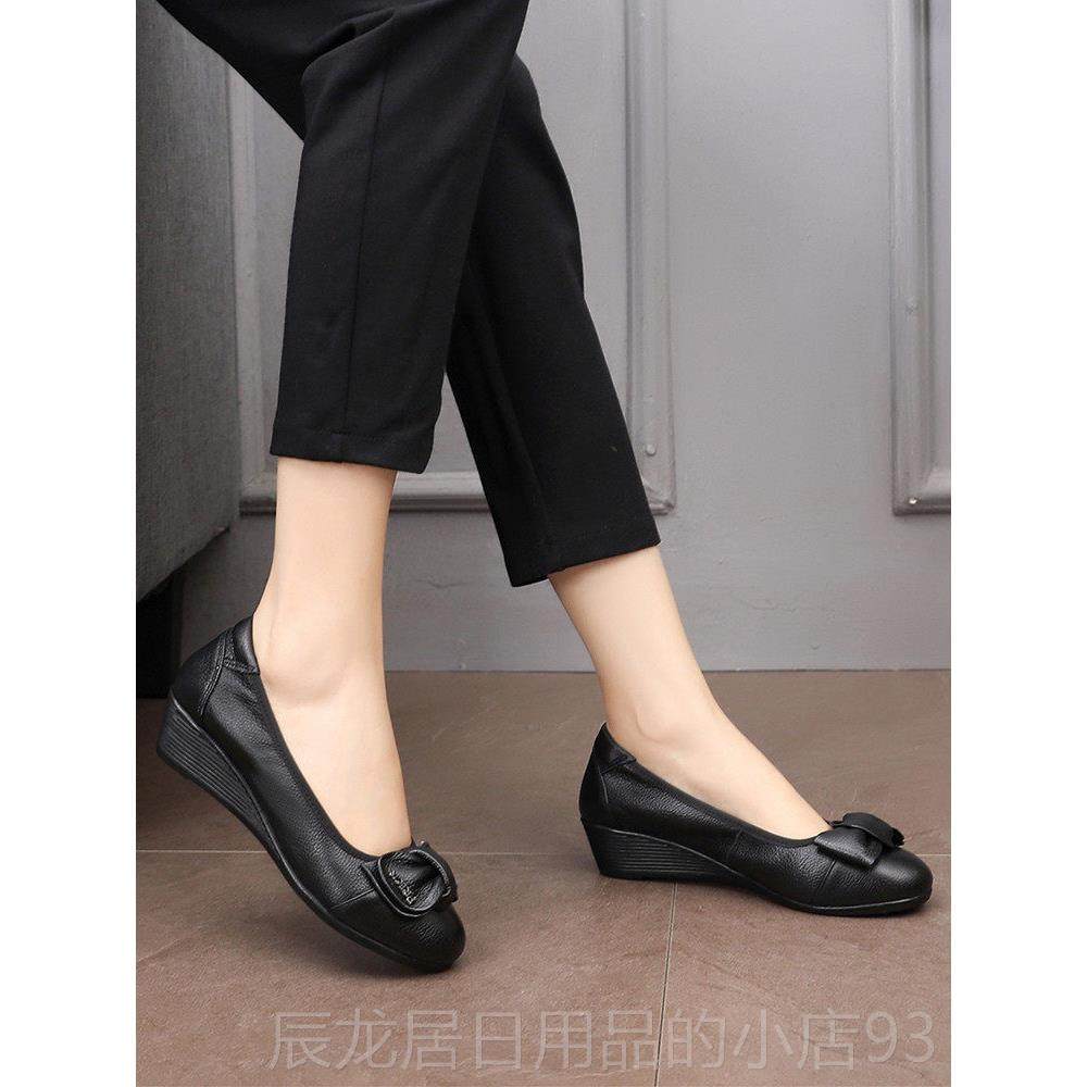 正品秋舒适妈鞋真皮坡跟单鞋春中女软底年女式妈皮鞋黑色中老年休