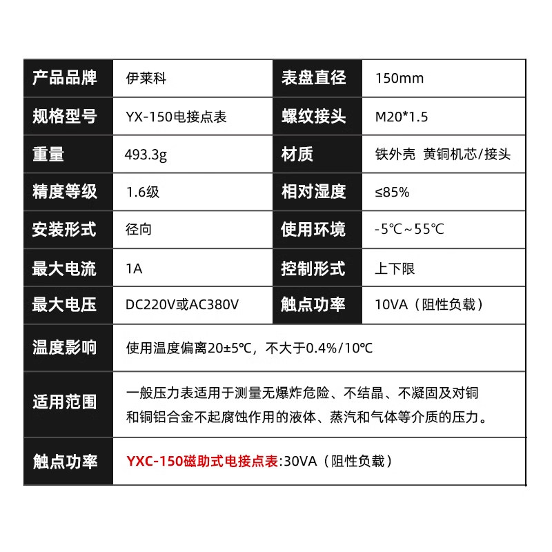 伊莱科YX/YXC-150磁助式电接点压力表真空水油气压上下限控制开关