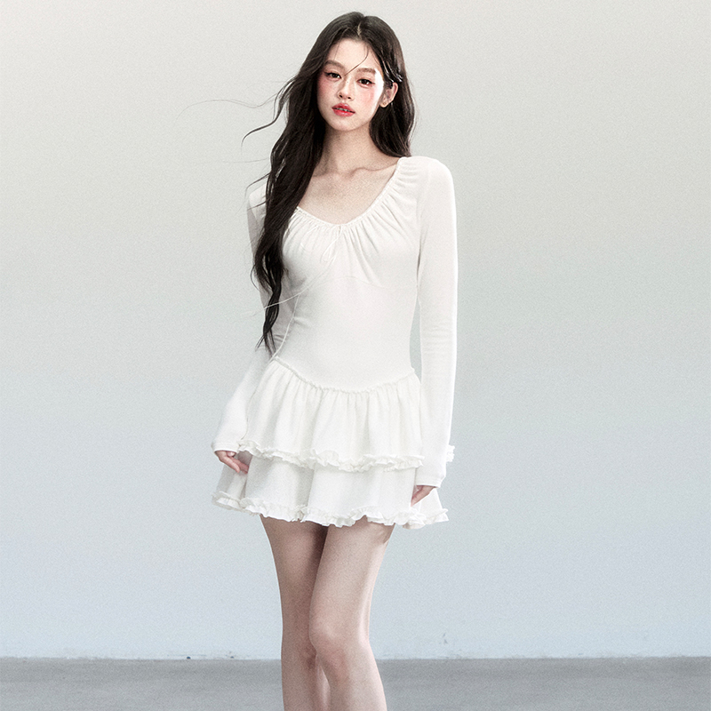 【现货】易碎商店芭蕾风v领针织打底木耳边慵懒修身叠穿连衣裙冬
