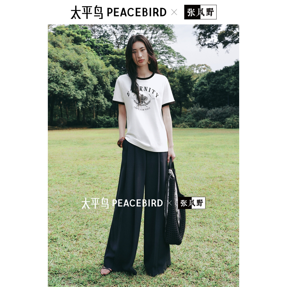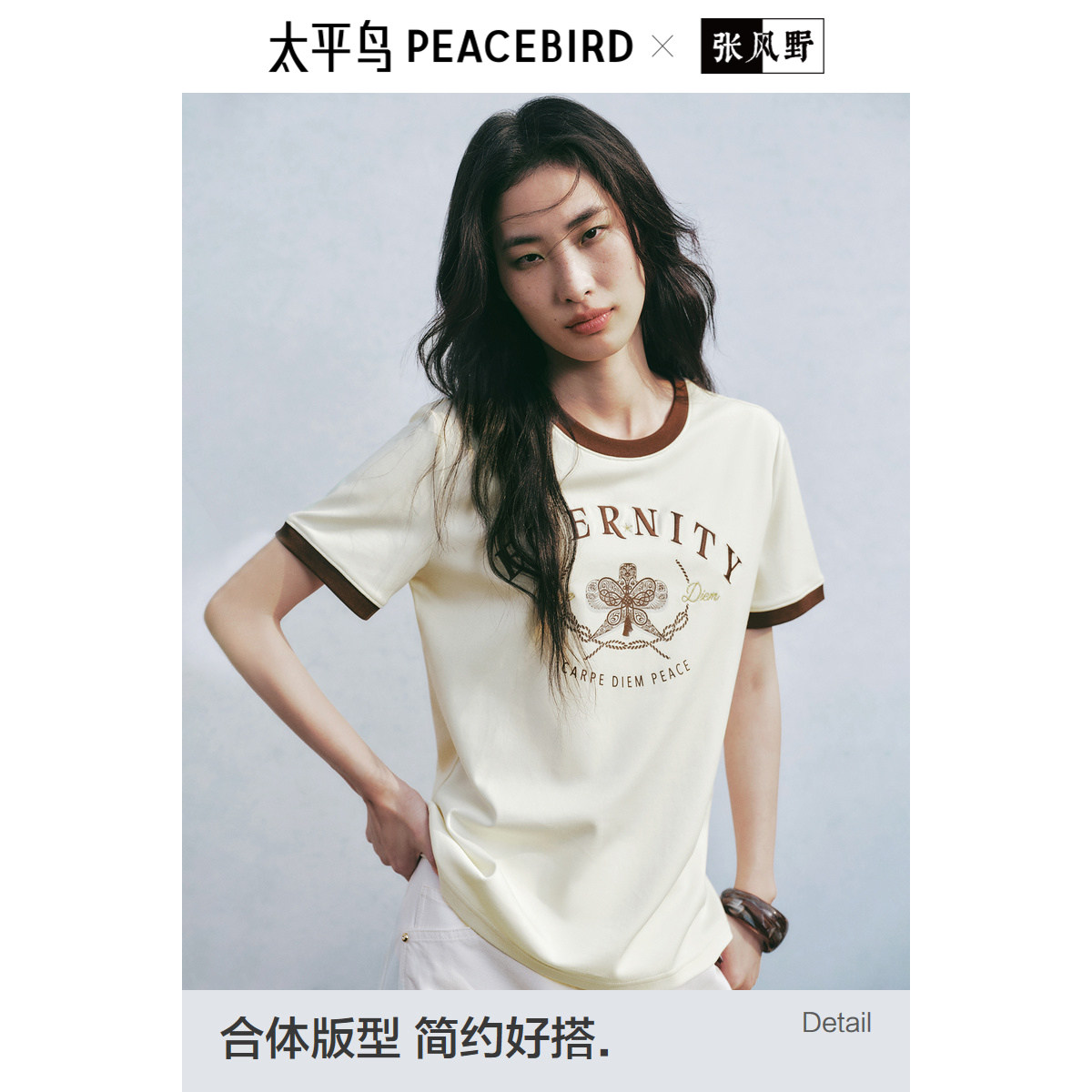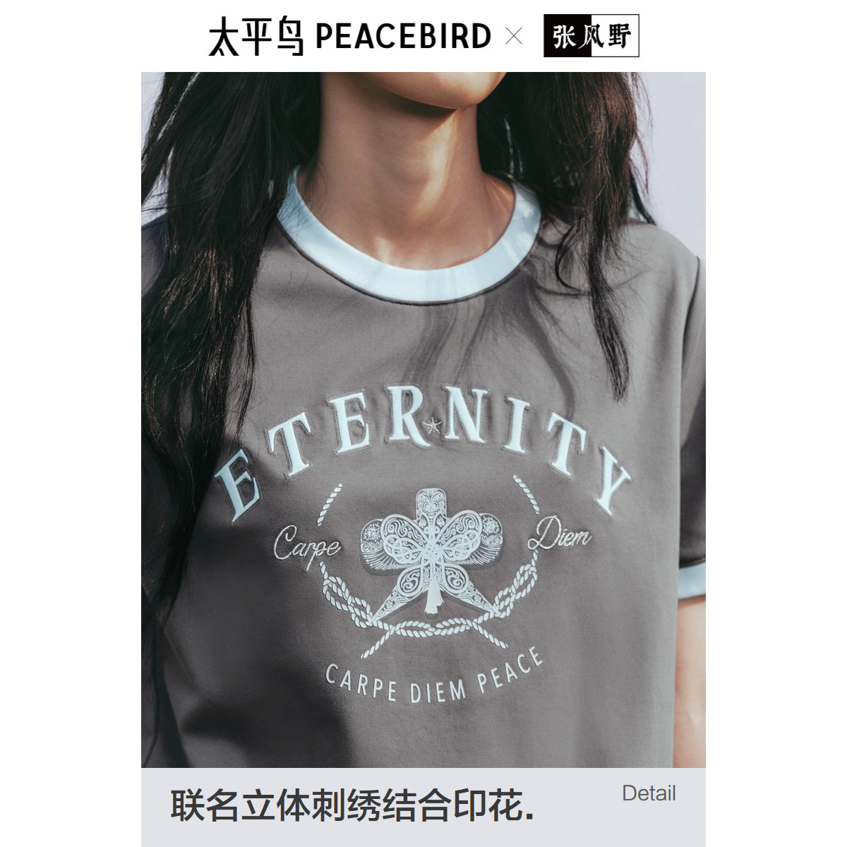 张风野联名 太平鸟奶油棉短袖T恤25夏季新款圆领刺绣图案撞边上衣